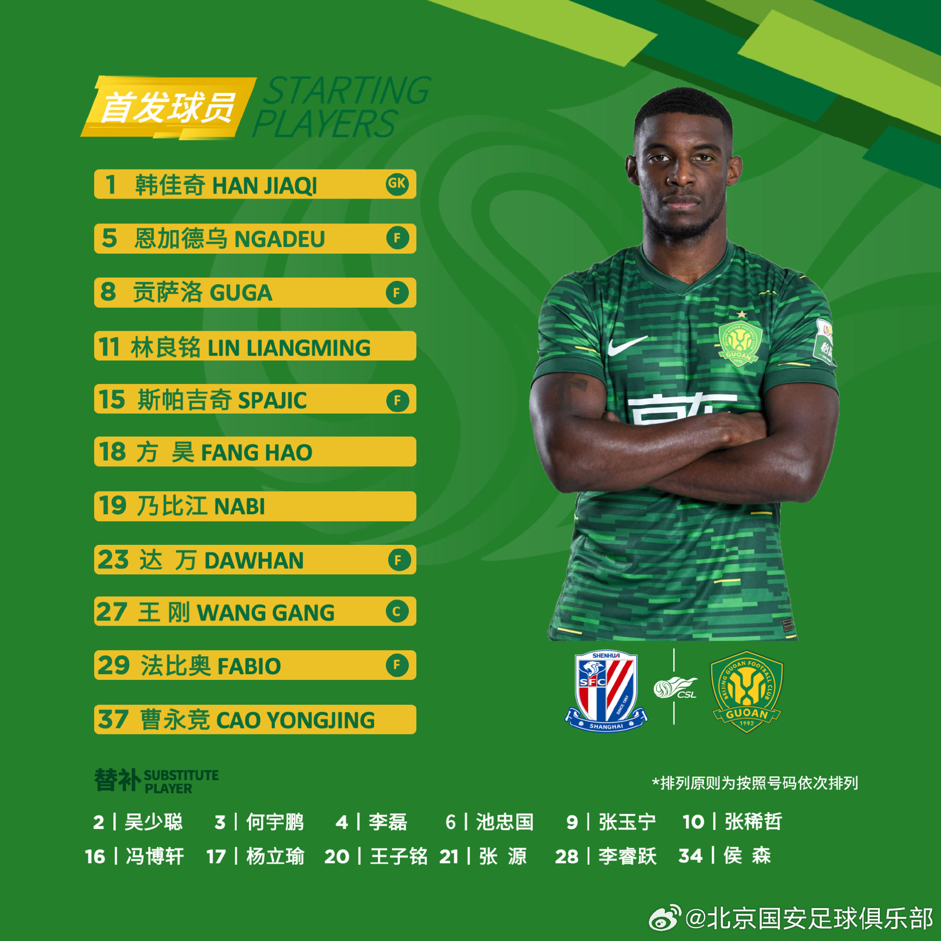 由于中卫柏杨上轮两黄被罚出场,本轮停赛,国安面临后防调整。最后一个加盟球队的塞尔维亚中卫斯帕吉奇近一周跟随球队合练,且状态不错,塞蒂恩将其列入首发。国安首发11人为:门将韩佳奇,后卫王刚、恩加德乌、斯帕吉奇、乃比江,中场林良铭、达万、古加、方昊、曹永竞,前锋法比奥。