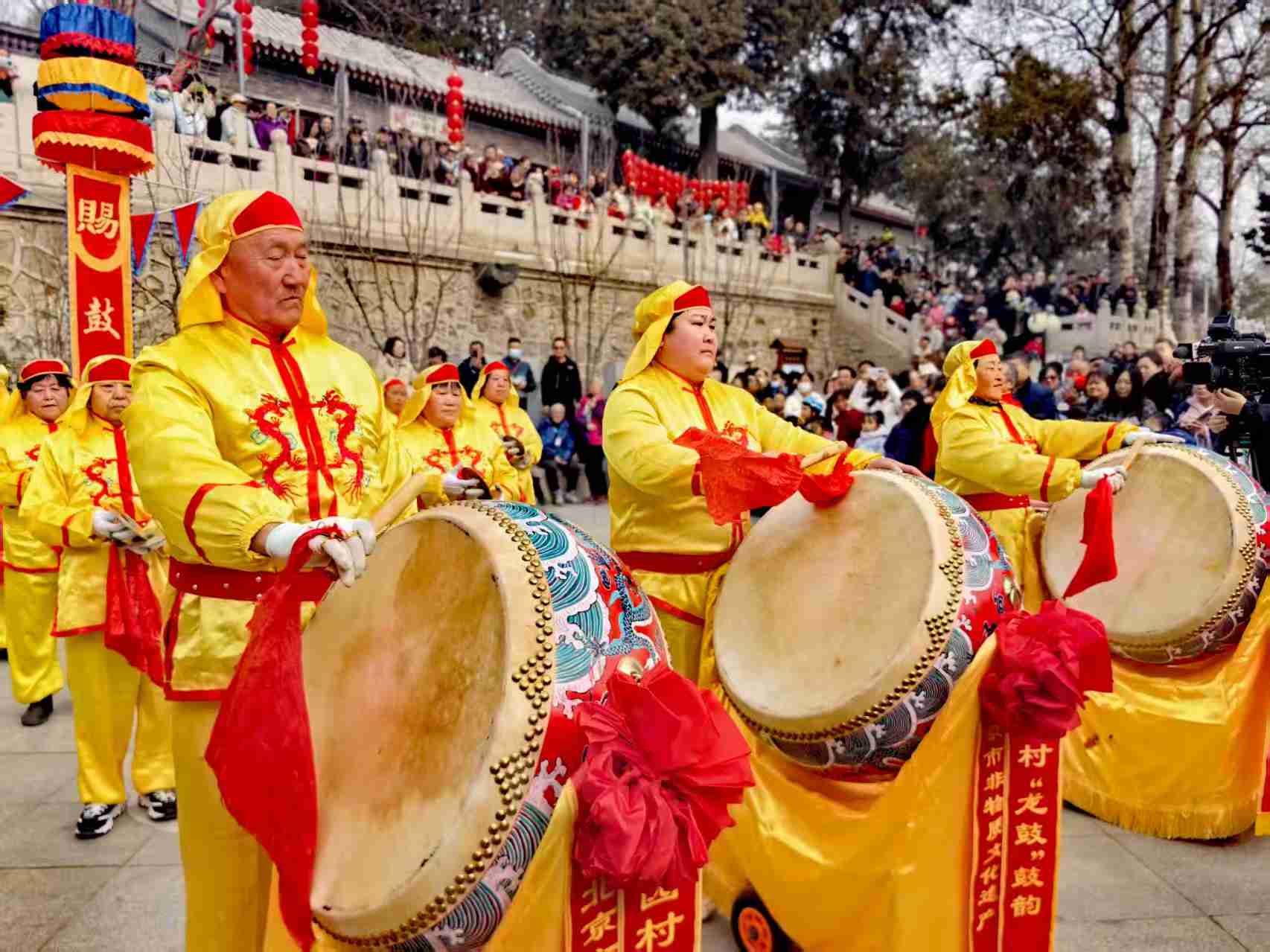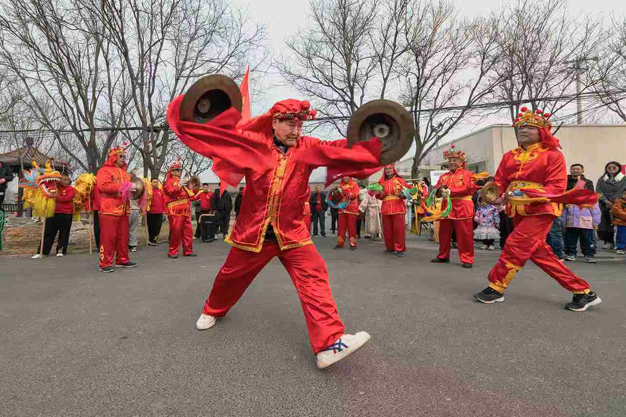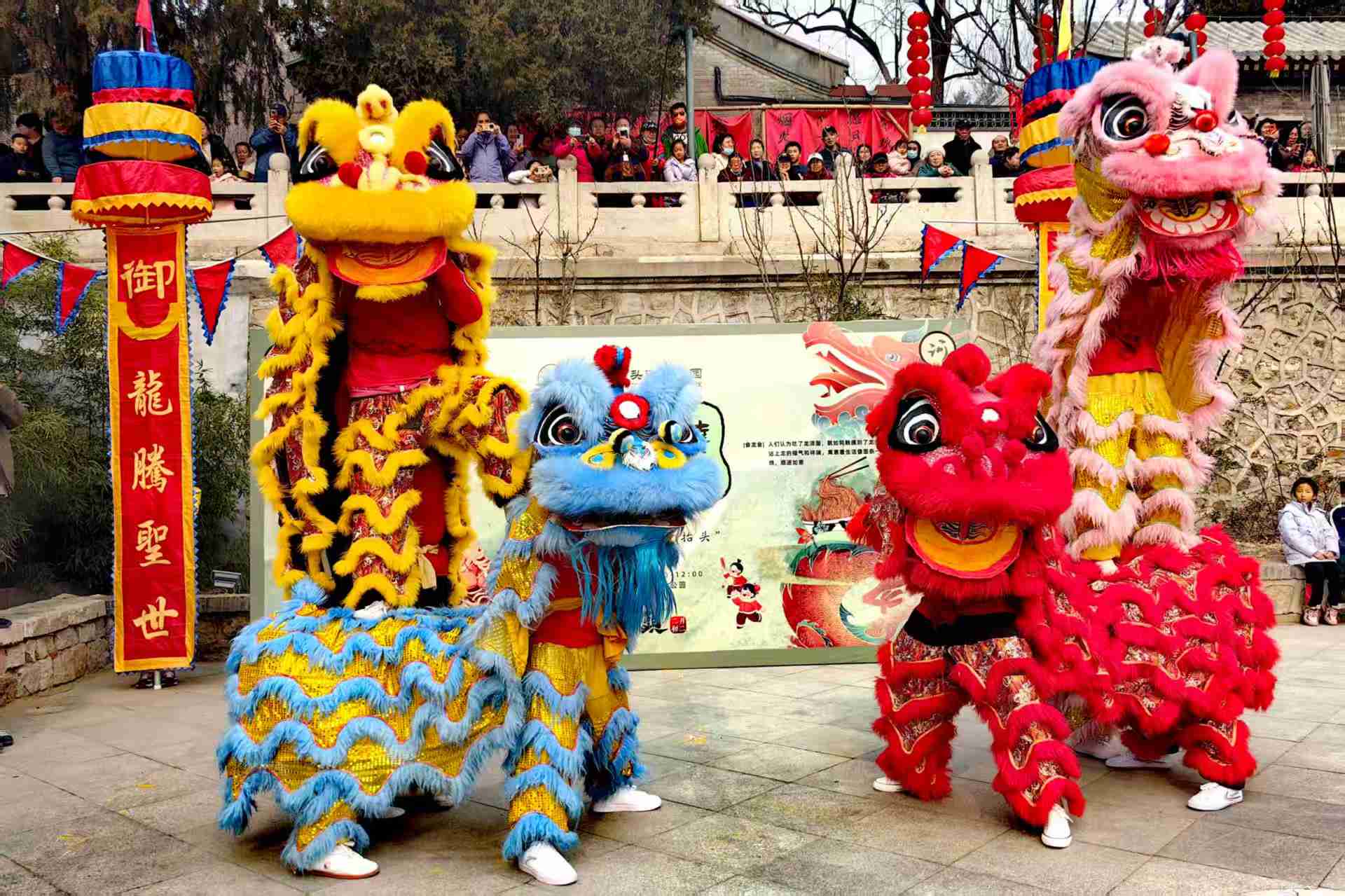 2025年3月1日,北京通州区台湖镇唐大庄村,上演了以“神龙昂首,鸿运当头——龙抬头”为主题的民俗文化活动,舞狮人与游人互动,大人小孩围着狮子,用手摸摸狮子头,希望讨个好彩头。