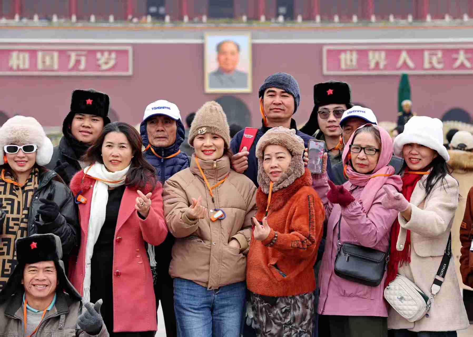 游客纷纷穿厚冬装游览天安门