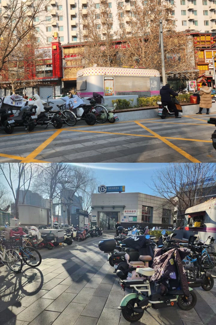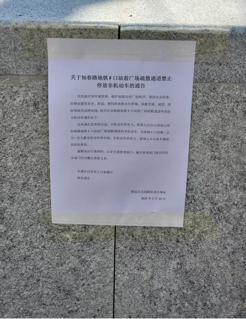 此前,本端报道了知春路地铁F口“口袋花园”被大量非机动车“侵入”的现象。2月26日,海淀区花园路街道办事处已在地铁口的口袋花园以及违规停放的所有车辆上都张贴了《关于知春路地铁F口站前广场疏散通道禁止停放非机动车的通告》。通告提出,非机动车所有人、管理人应自行将占用疏散通道的非机动车,转移至地铁口西侧的非机动车停车场。同时提醒,若逾期未清理,相关部门将代为履行清理义务。记者看到,地面上施划了崭新的禁停线,明确规划出非机动车禁停区域,站前广场的非机动车基本实现了有序停放。口袋花园内原本被非机动车遮蔽的座位也露出了真容,不时有行人在此停驻、休憩。除此之外,现场还有专人巡逻值守,密切关注停车情况。