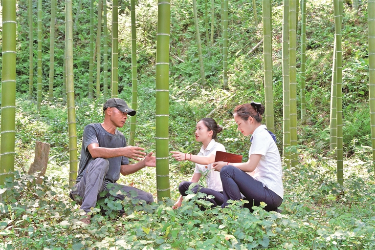 浙江省安吉农商银行工作人员向村民宣传介绍竹林碳汇系列信贷产品。资料图片