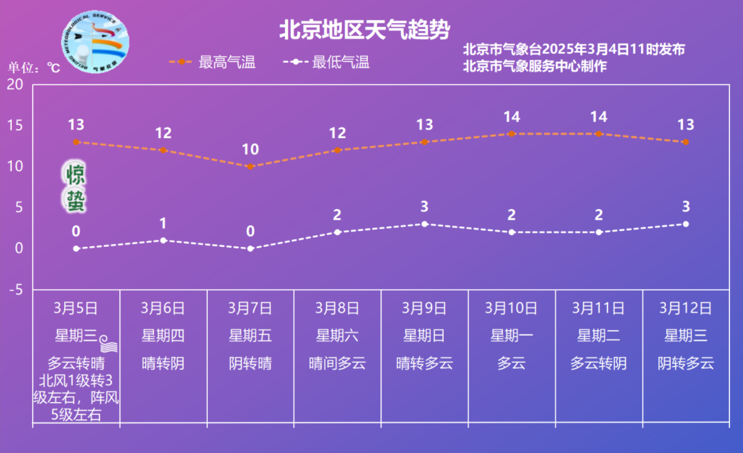 明天(周三)即将迎来惊蛰节气,气温有所回升,不过北风会逐渐加大,夜间阵风可达5级左右,空气干燥,请注意用火及用电安全。户外加强保暖,并远离临时搭建物及广告牌等设施。