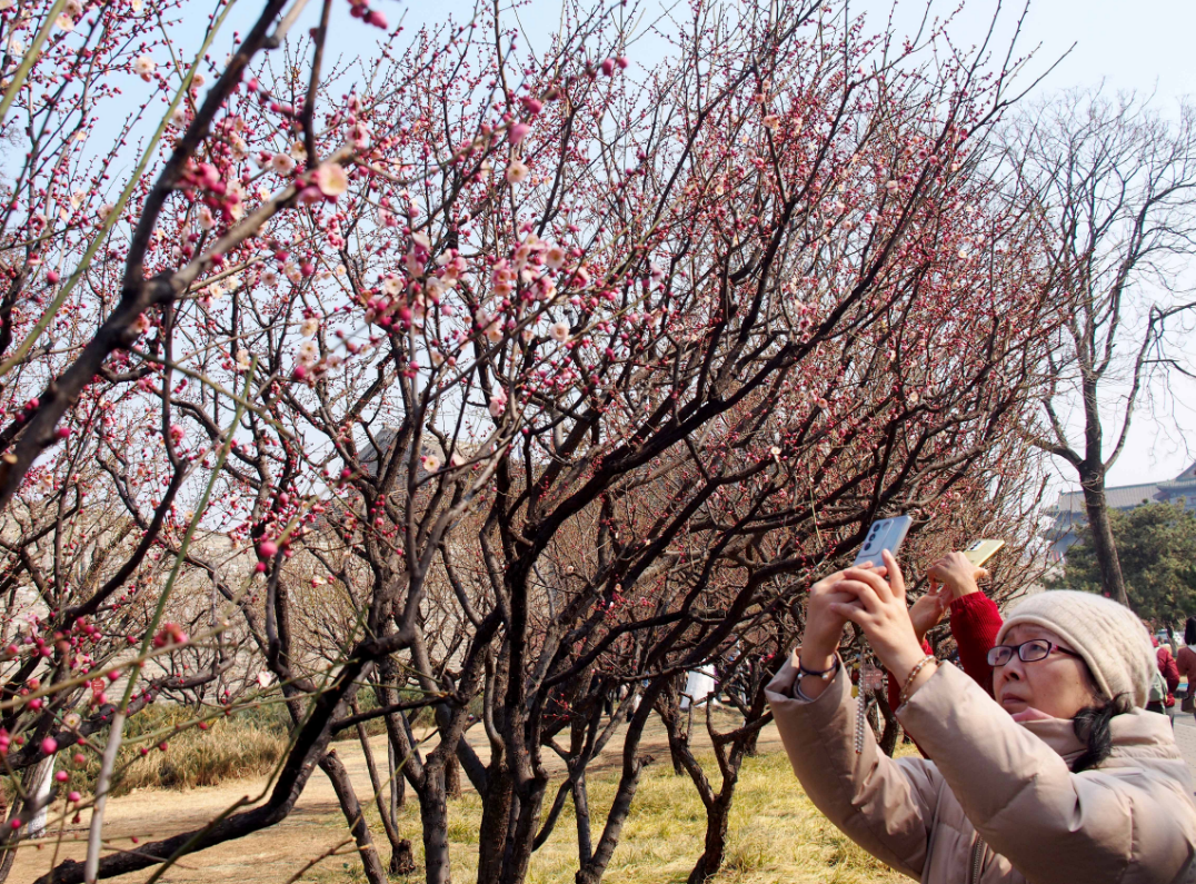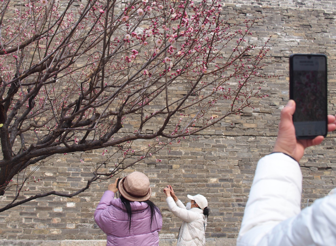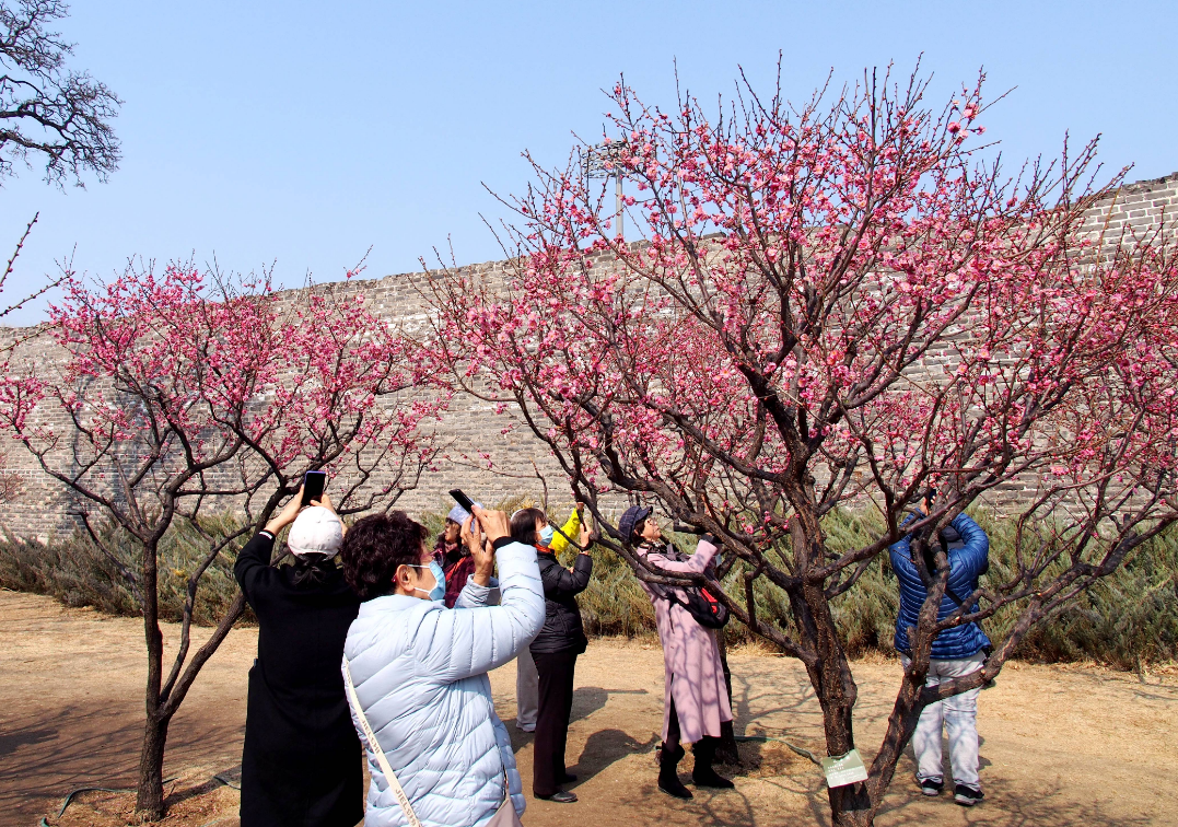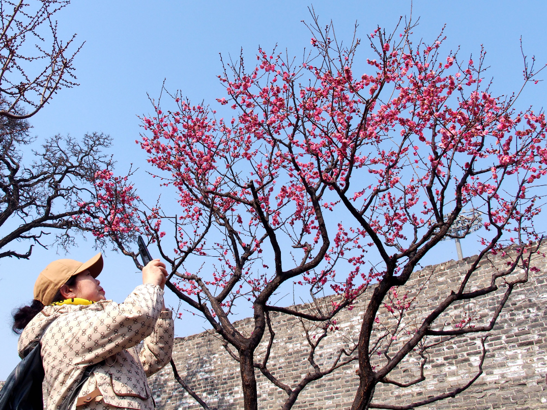 3月5日,明城墙遗址公园迎来梅花绽放,人们纷纷前来赏梅。