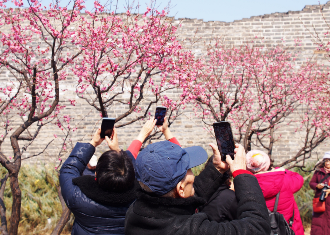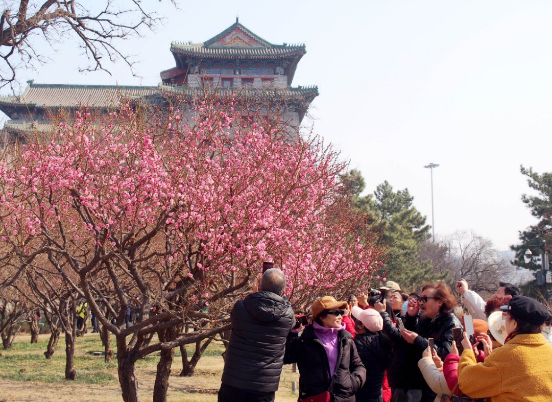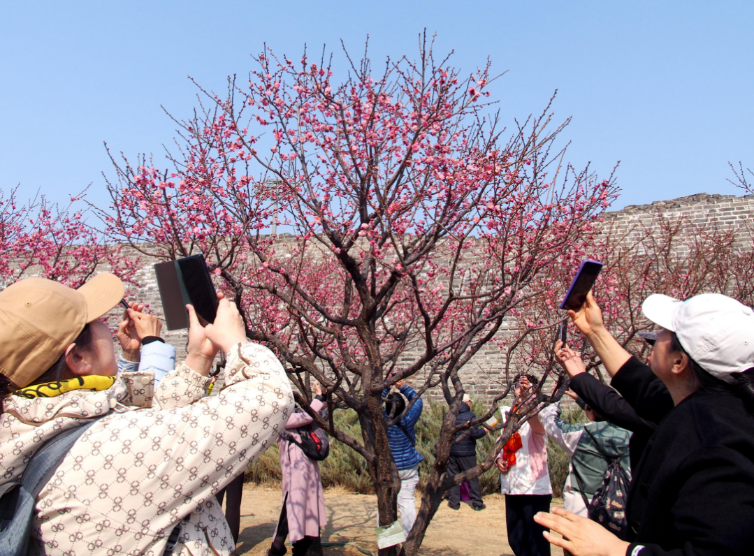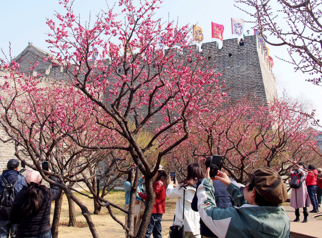 3月5日,明城墙遗址公园迎来梅花绽放,人们纷纷前来赏梅。