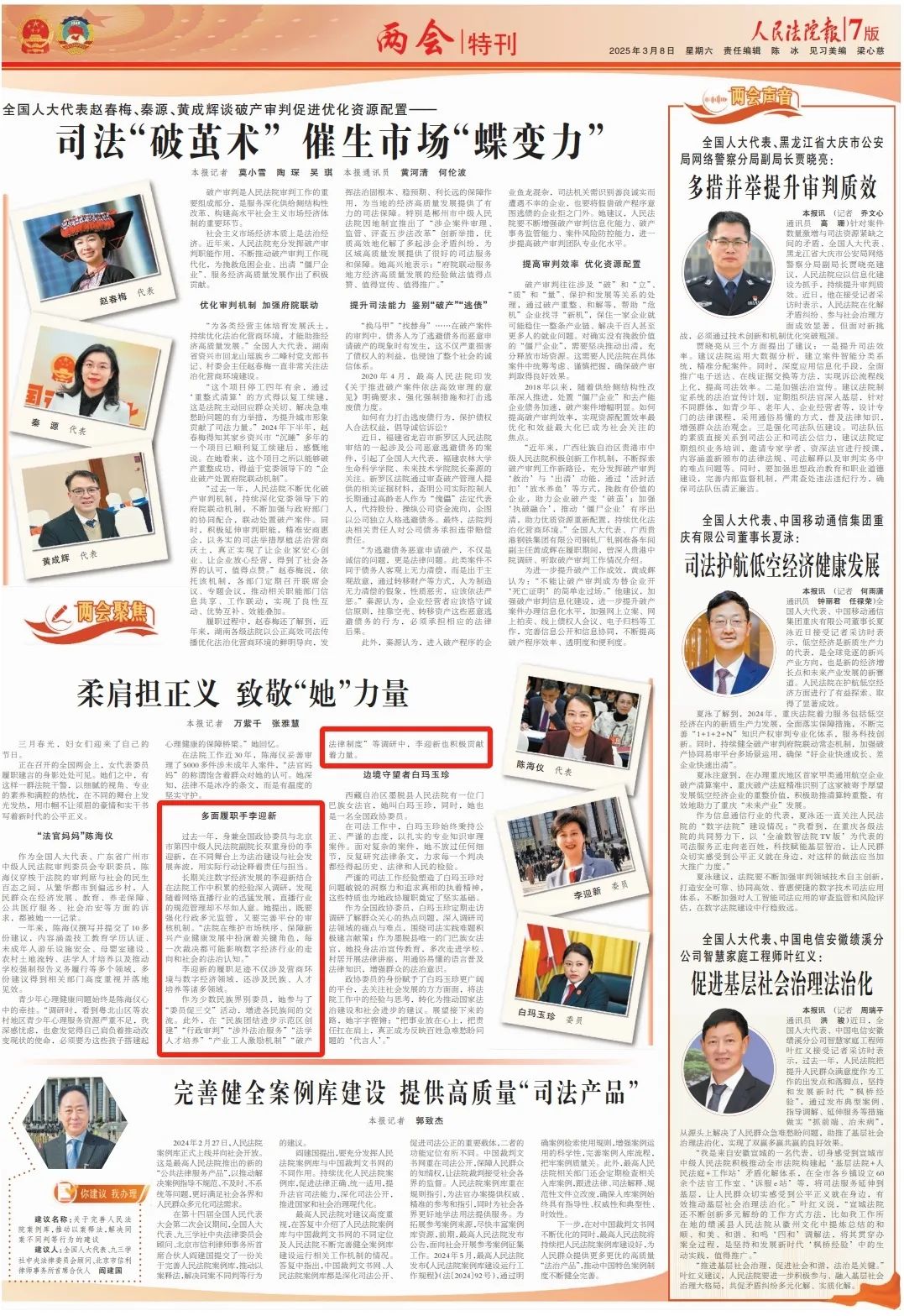 正在召开的全国两会上,女代表委员履职建言的身影处处可见。她们之中,有这样一群法院干警,以细腻的视角、专业的素养和满腔的热忱,在不同的舞台上发光发热,用巾帼不让须眉的豪情和实干书写着新时代的公平正义。