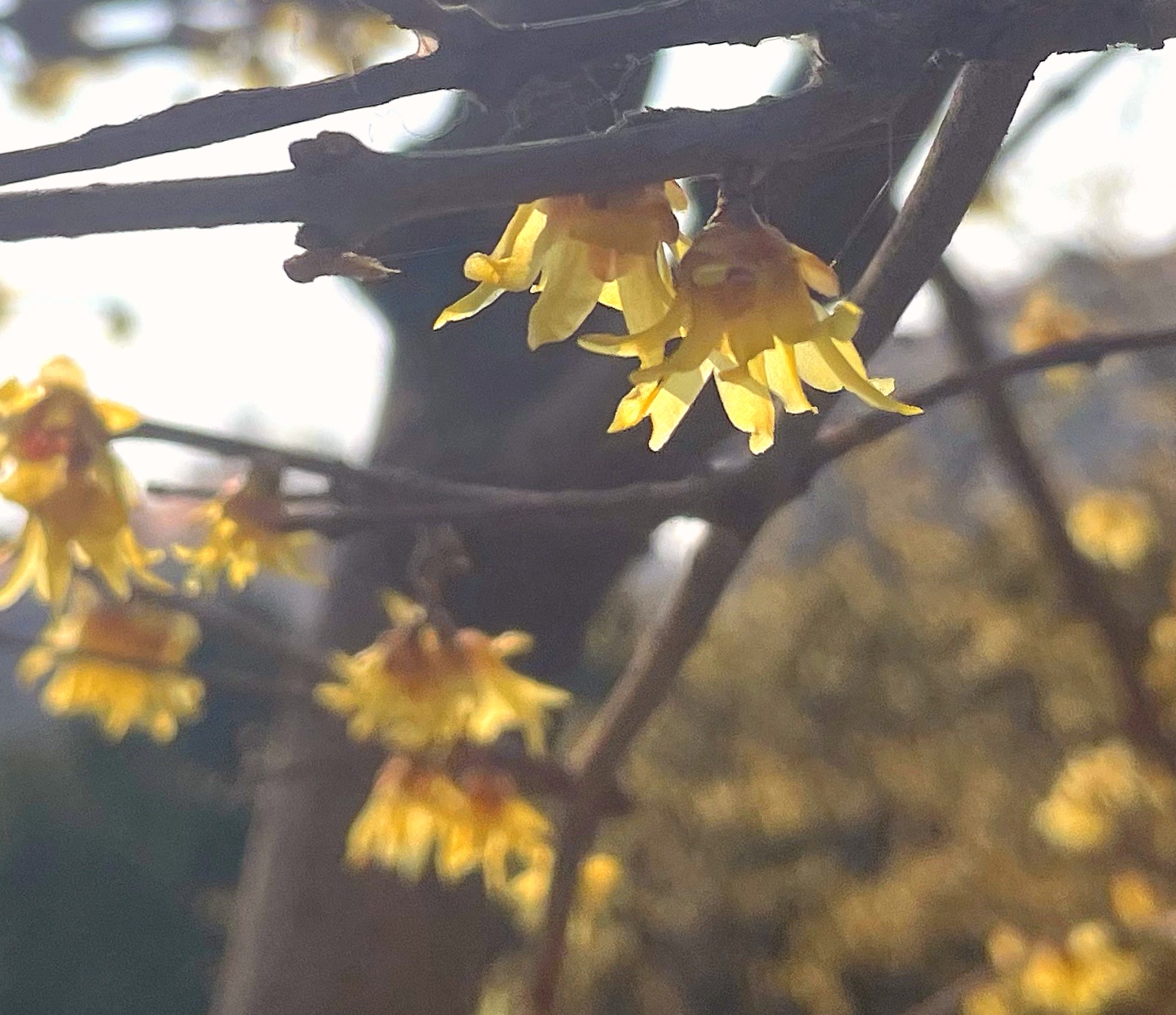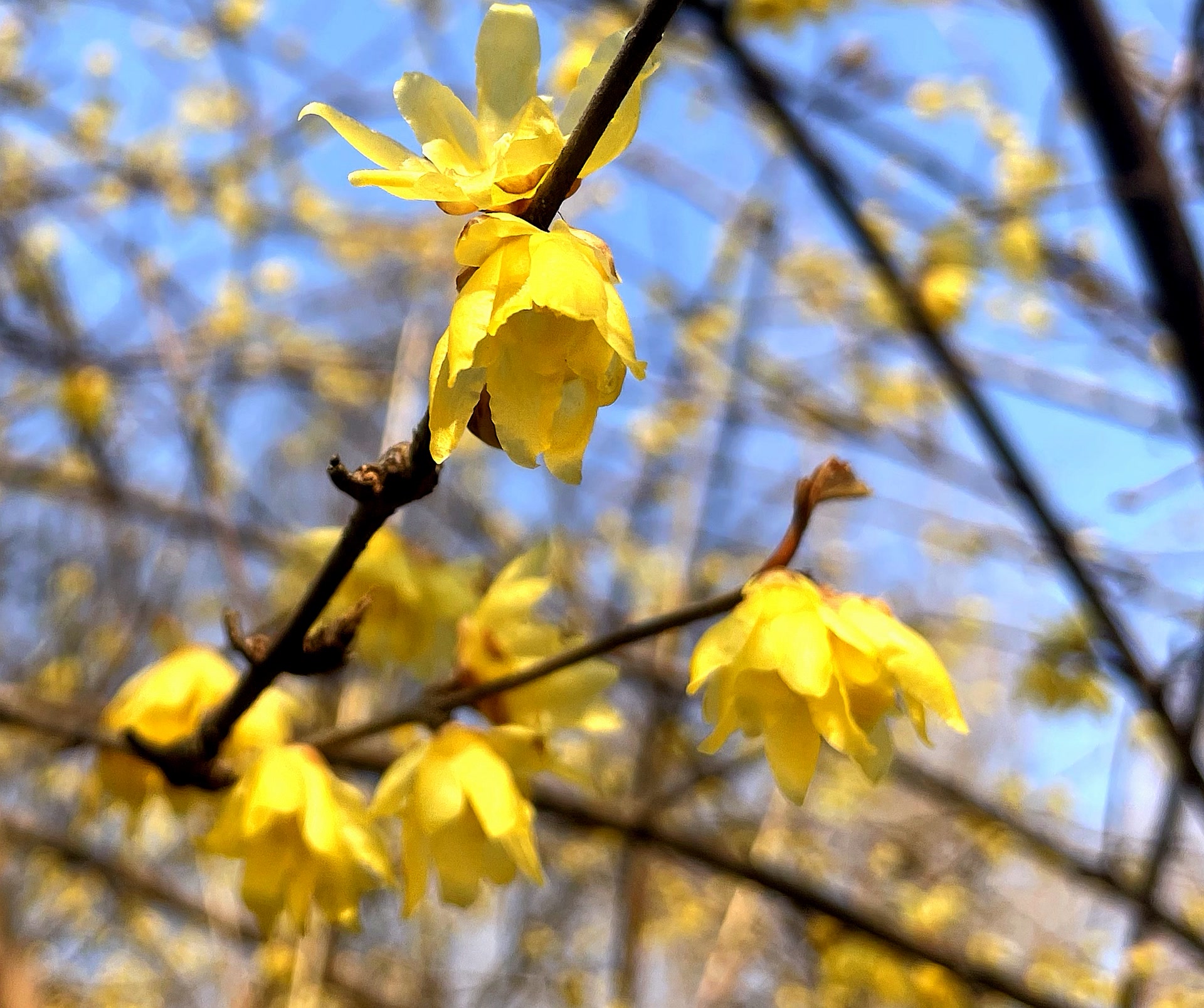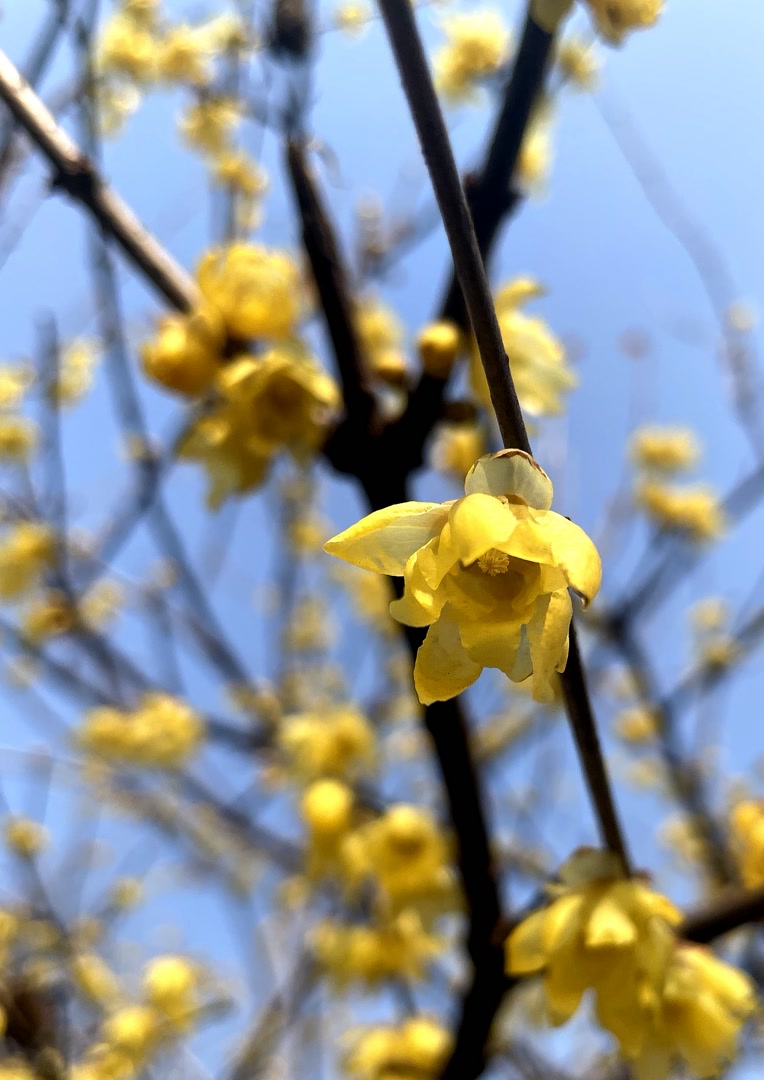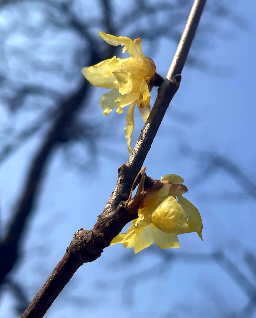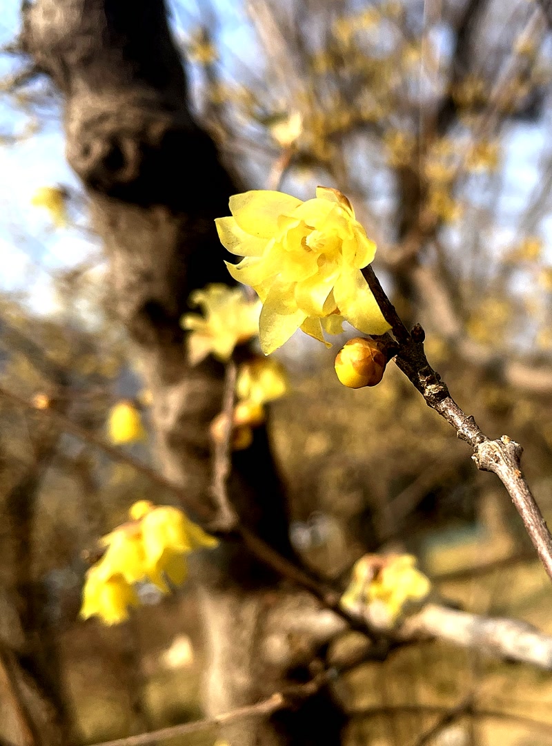 3月8日午后,漫步营城建都滨水绿道,从金宫殿故址行至金中都公园,一路上天光水色,春意显露。在疏落的林木和尚显灰暗的枝条丛中,一树树、一朵朵明黄色的蜡梅相继绽放。
