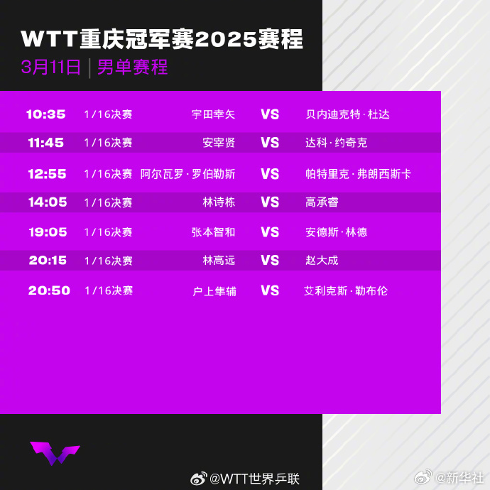 WTT重庆冠军赛2025将于3月11日至16日举行。@WTT世界乒联发布首轮比赛对阵赛程:孙颖莎、王楚钦、林诗栋、林高远、王曼昱、王艺迪、蒯曼、梁靖崑等国乒队员首轮出战。详戳↓