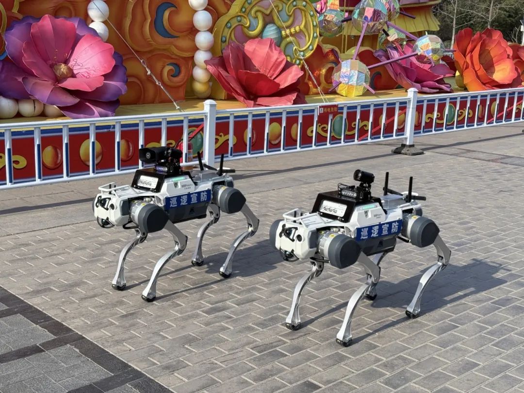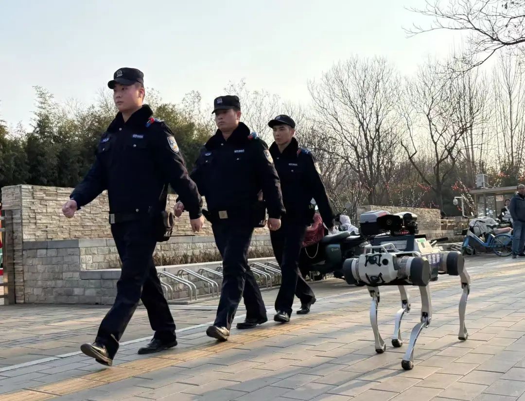 3月8日,在北京经开区博大公园内,两只灰白相间、身上贴有“巡逻宣防”字样的机器犬与智慧巡逻车队成为游客和市民关注的焦点。