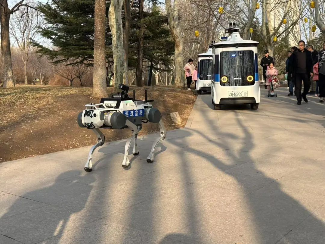 “在巡逻区域内,车队昼夜不息穿梭,巡逻效率较传统模式提升3倍,可大幅压缩防控盲区。”据北京经开区有关负责人介绍,外形酷似机械猎犬的智慧机器犬,凭借IP67防护等级与4小时续航能力,可适应暴雨、高温等极端环境。其背部模块化设计支持快速加装防爆设备、气体检测仪等工具,可灵活应对巡逻、排爆等多样化任务。通过5G网络与无人车实时联动,机器犬负责地面精细巡查,无人车则提供物资补给与数据回传,形成“前哨侦察+后方支援”的高效协作模式。