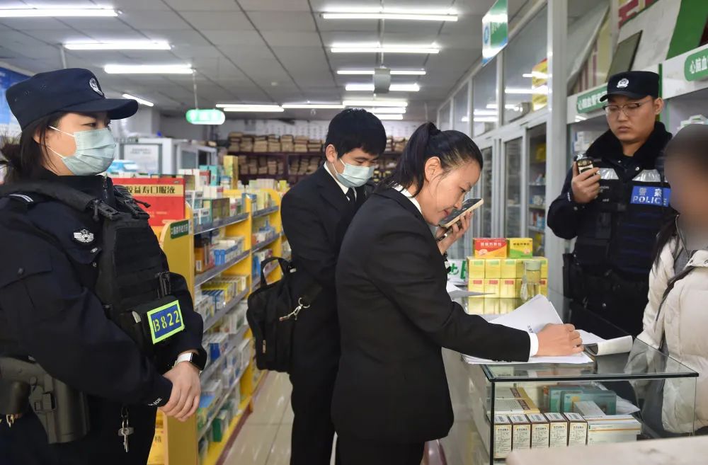3月4日,在北京市海淀区一家药店,海淀区人民法院执行局法官刘莹(左三)与案件当事人电话沟通。