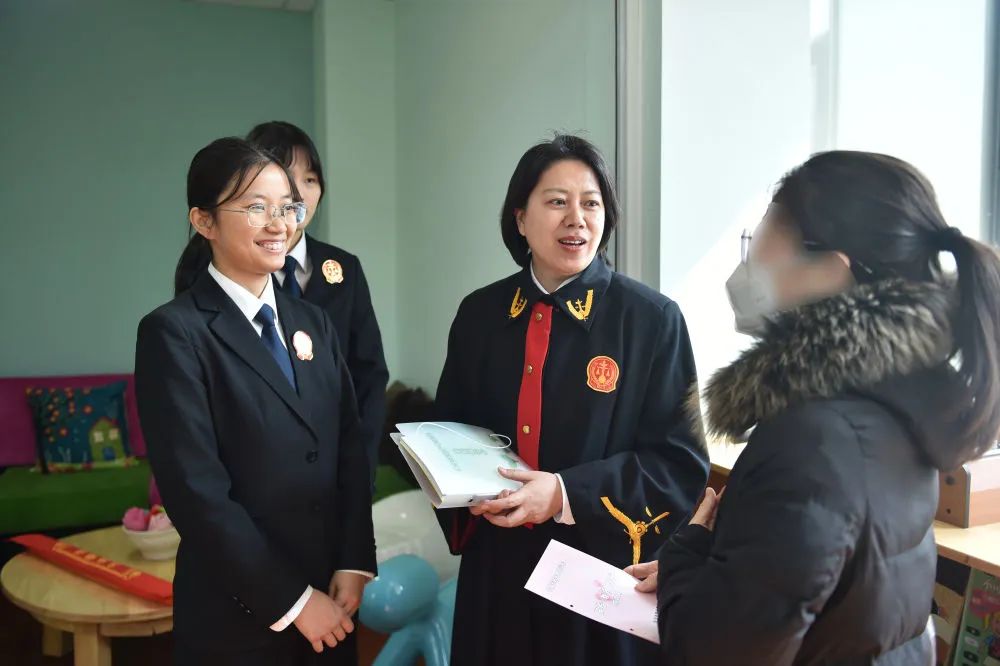 3月4日,在北京市海淀区人民法院温泉人民法庭(少年法庭),法官张莹(右二)与当事人交流。
