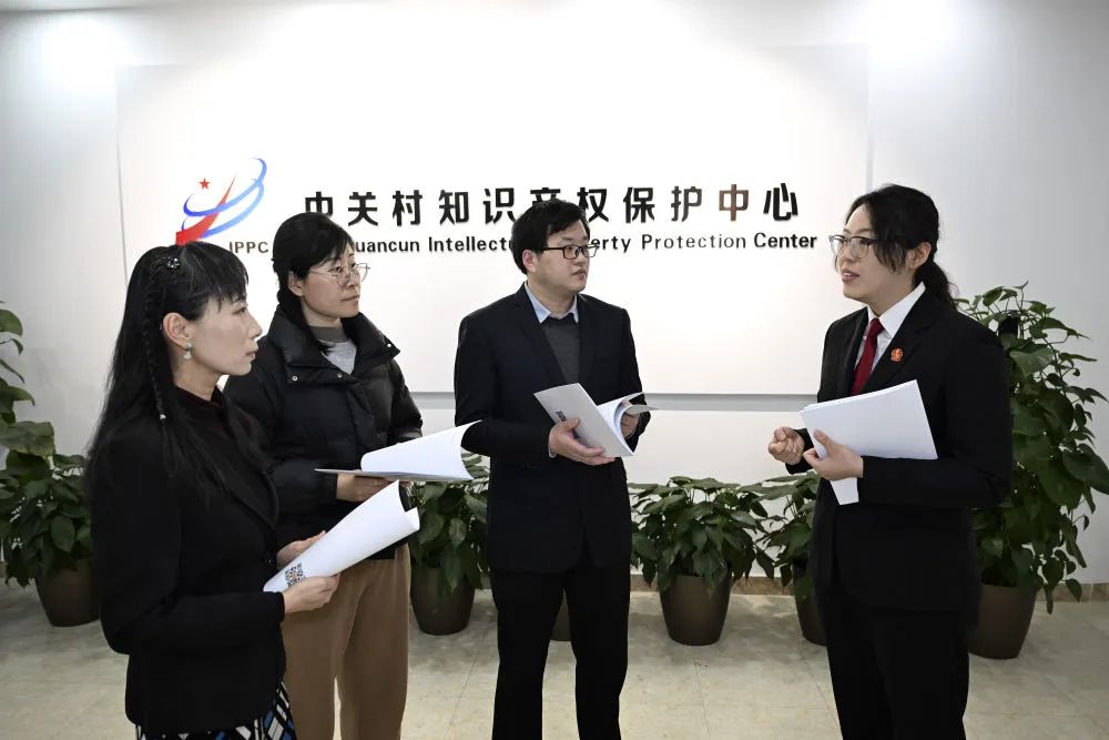 3月7日,在北京市海淀区中关村知识产权保护中心,海淀区人民法院法官李思頔(右一)与该中心工作人员交流知识产权保护工作。