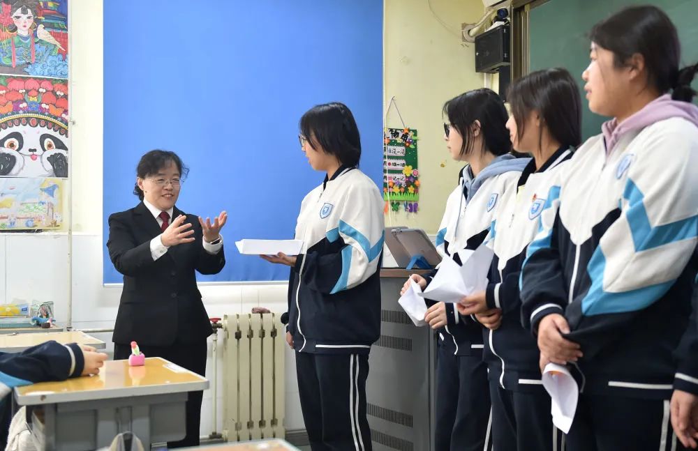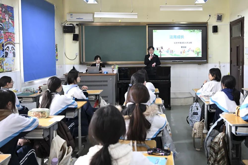3月7日,在北京市信息管理学校(蓟门校区),海淀区人民法院温泉人民法庭(少年法庭)法官曹晓颖在“法育成长”普法宣传课上与学生们交流。