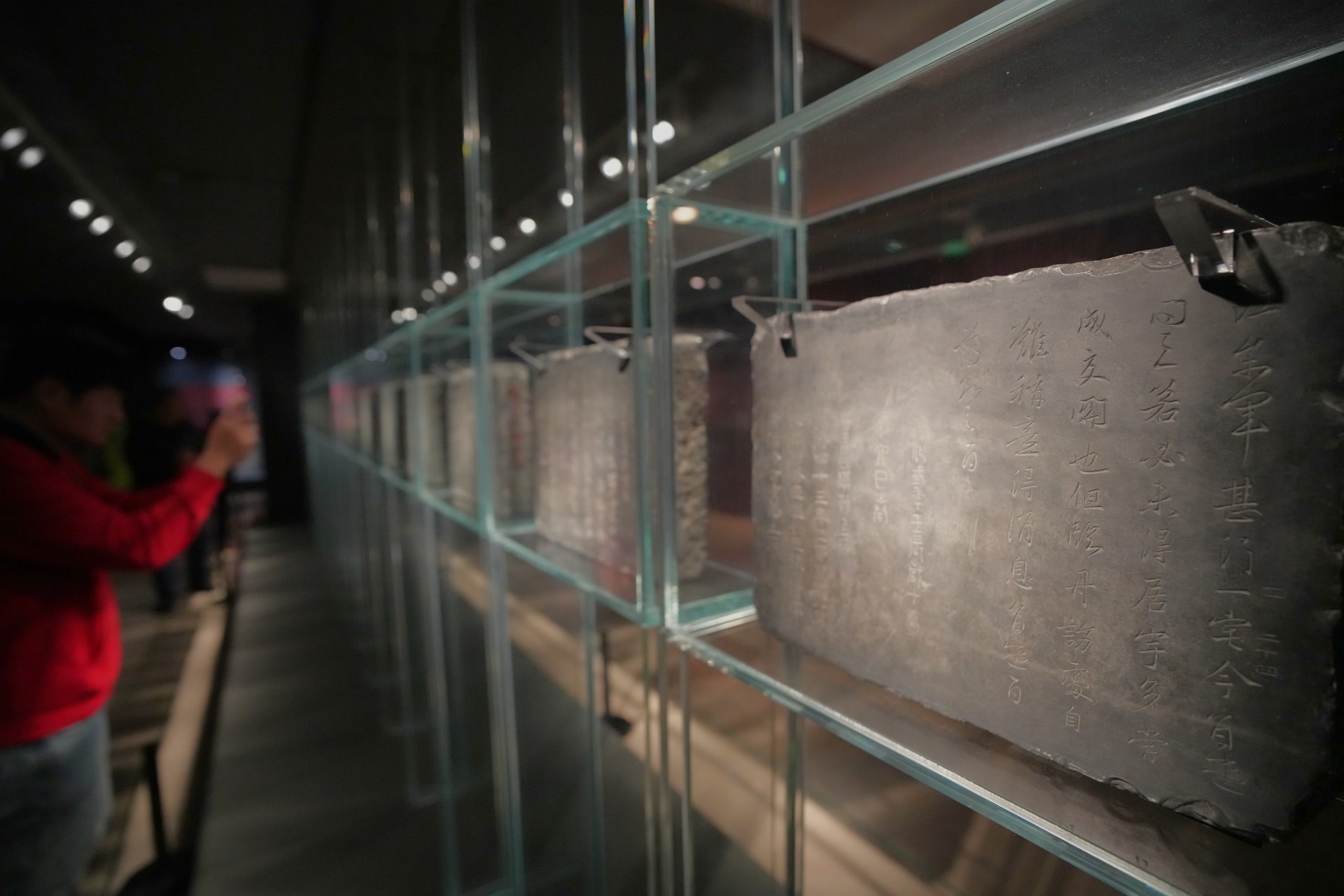 位于展览入口处“C位”的15块刻石,选自明代肃王本《淳化阁帖》刻石,全套共142块,是现存时代最早、质量最好、保存最完整的一部淳化阁帖刻石。这套展品宛如一座碑林,将张芝的龙蛇飞动、索靖的银钩虿尾、王義之的中和遒逸、王献之的豪迈纵横,串联起刀锋、笔锋交融的中国书法名家图谱。