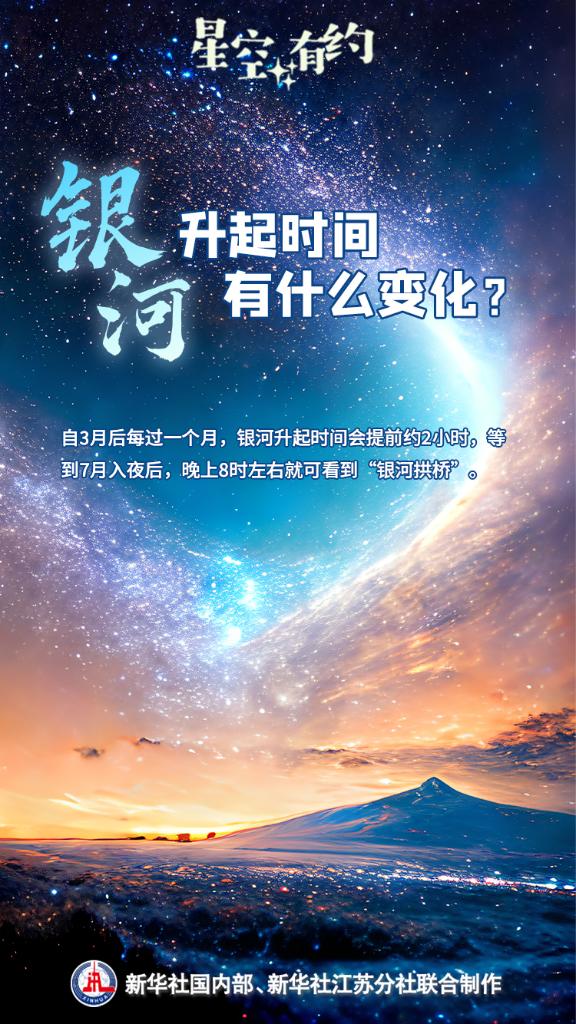 王科超解释,同一颗恒星,每天都比前一天提前大约4分钟升起,因此此后每过一个月,银河升起的时间会提前约2小时。等到7月,银河在入夜后便已升起,晚上8时左右就可看到“银河拱桥”。午夜前后,贯穿南北夜空的银河将升至最高点,这时可以看到银河几乎垂直,呈现“银河落九天”的景象。