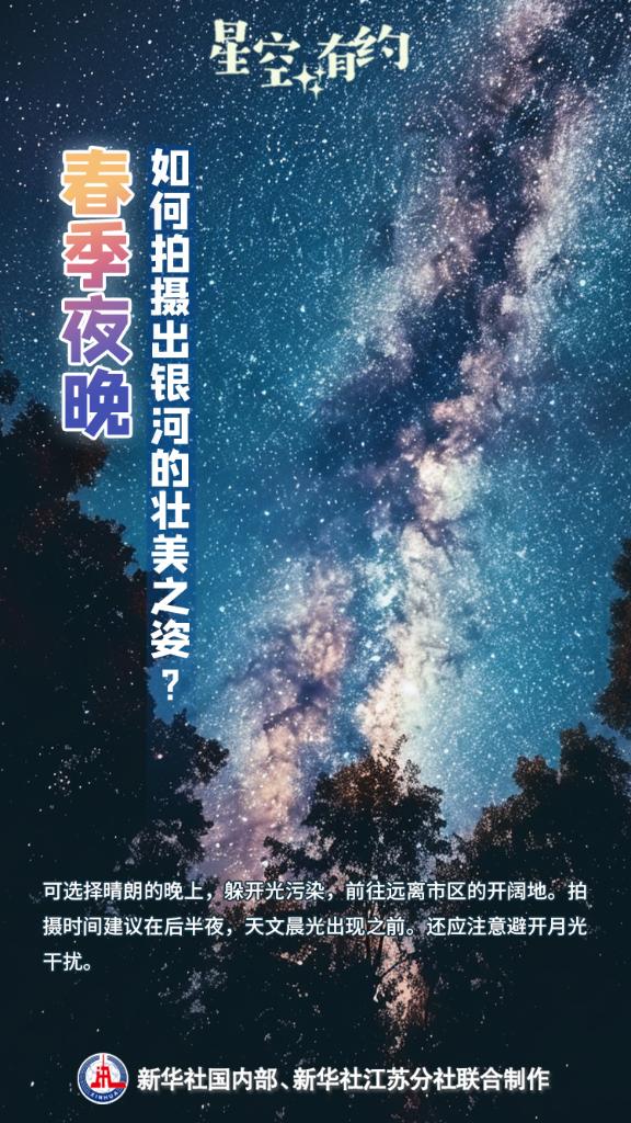 春季夜晚,如何拍摄出银河的壮美之姿?王科超说,拍摄银河可选择晴朗的晚上,躲开光污染,前往远离市区的开阔地。拍摄时间在后半夜,天文晨光出现以前。此外,拍摄者还应注意避开月光干扰。“银河拱桥”通常横跨180度或更大的范围,因此可以拍摄多张不同角度的照片,最终拼接得到一张大视角的照片,如结合地面景色构图效果更佳。