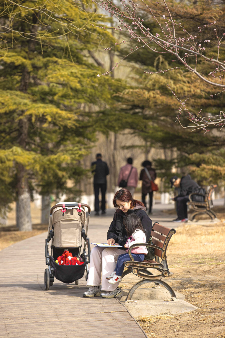 △亲子游园赏春,妈妈正悉心为女儿读绘本。张磊/摄