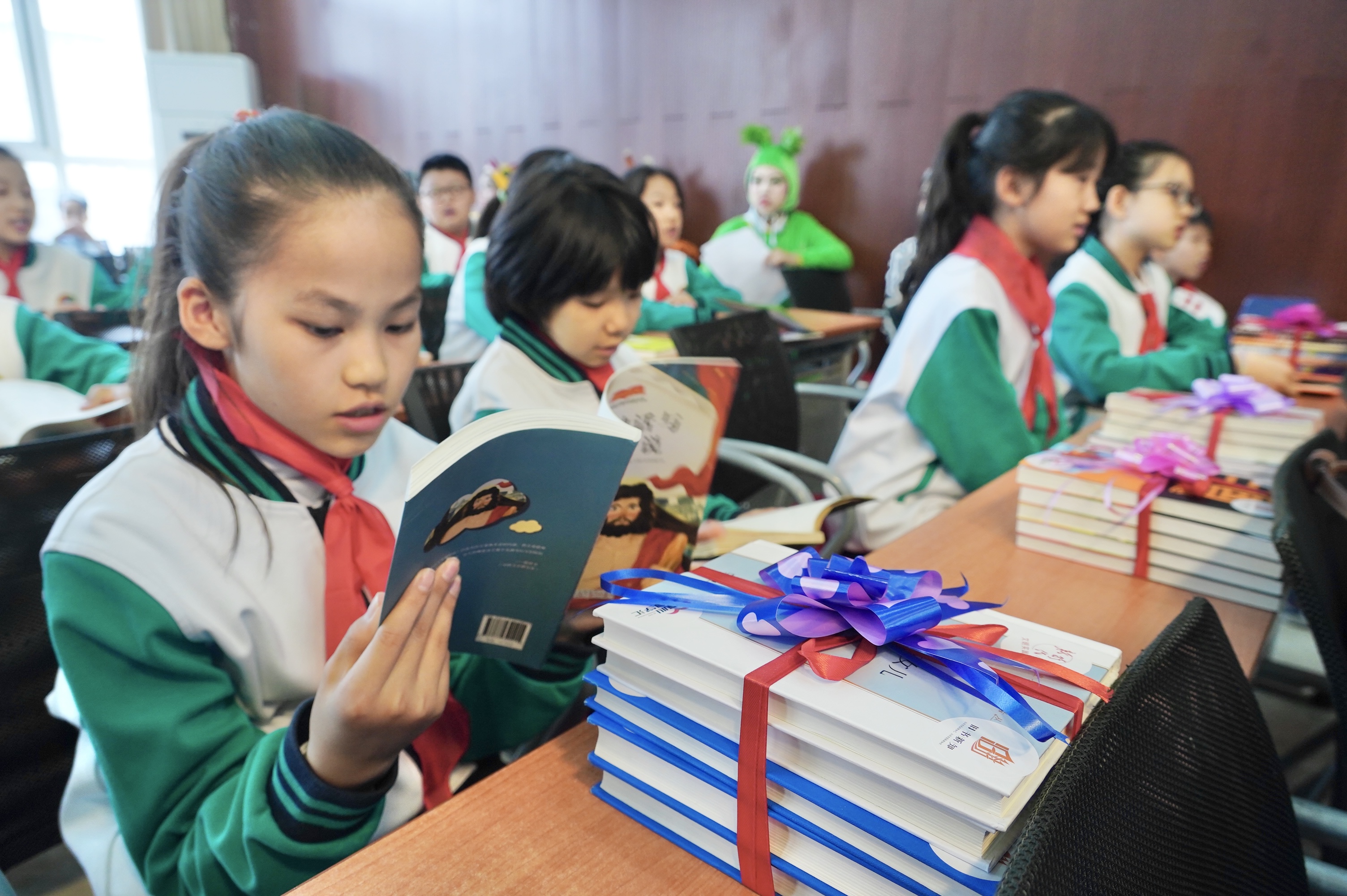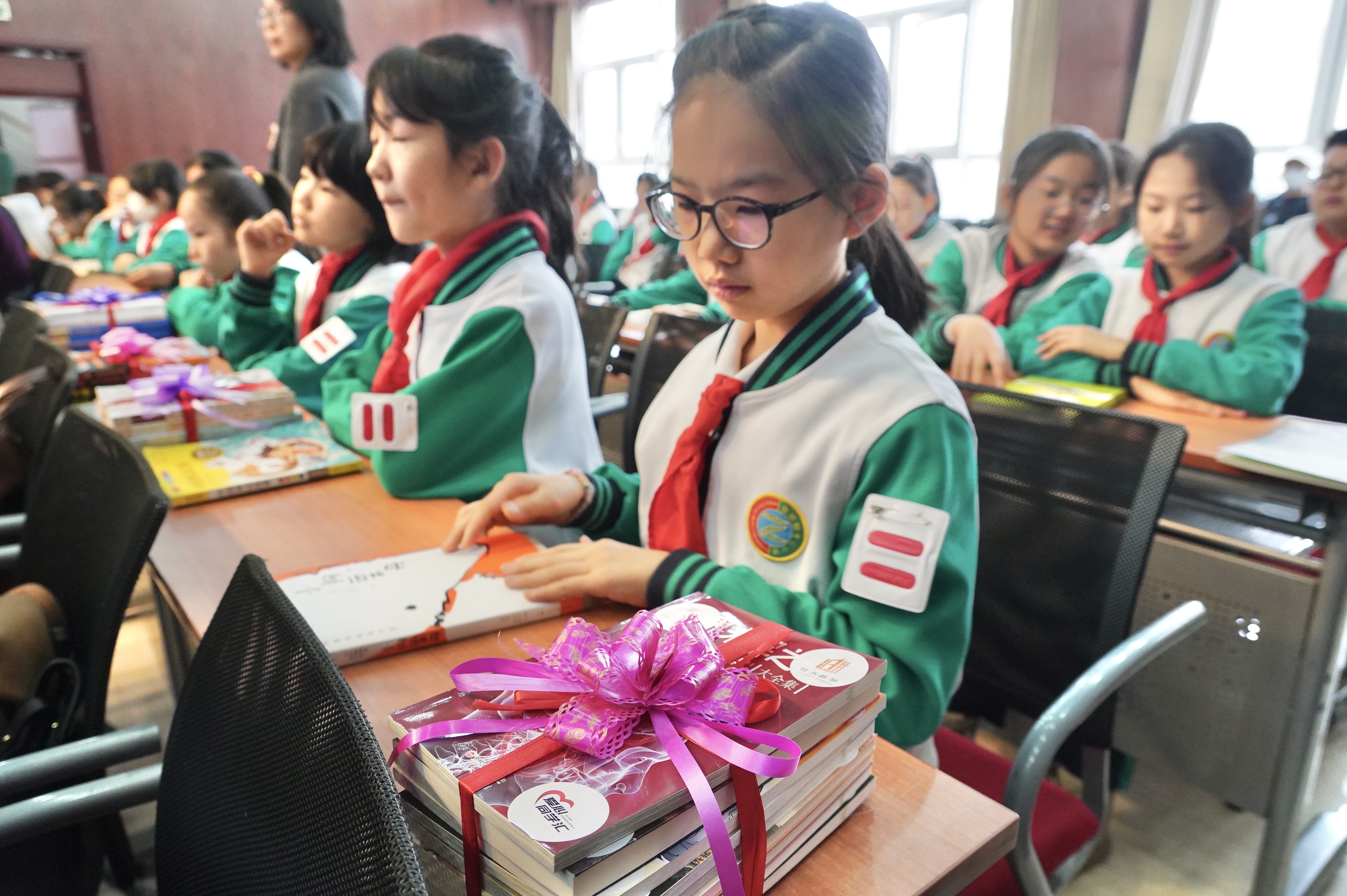 活动现场,来自北京爱心同学汇的社会单位代表们向学生们捐赠了180余本图书,学生们也从家中带来自己喜爱的图书共同汇入漂流的书海。