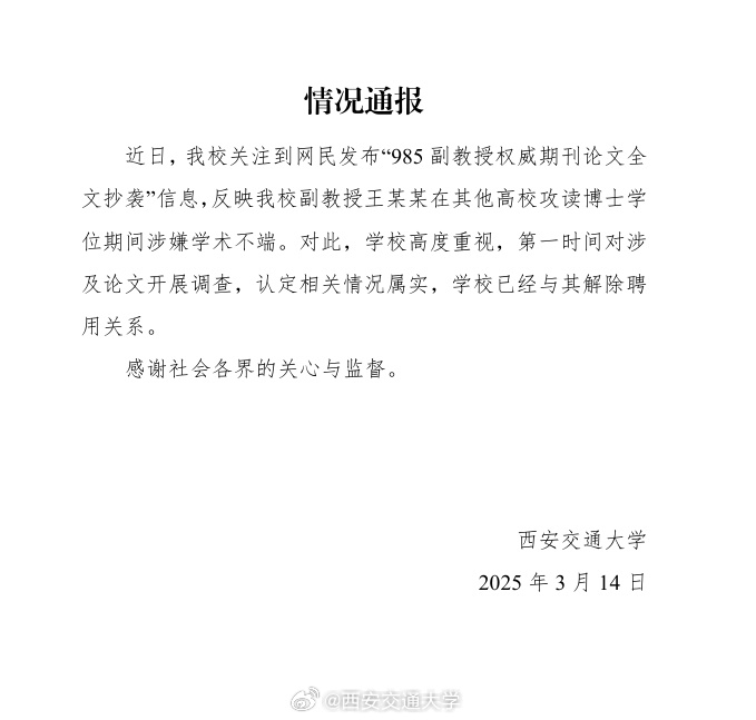 西安交通大学此前通报,近日,学校关注到网民发布“985副教授权威期刊论文全文抄袭”信息,反映该校副教授王某某在其他高校攻读博士学位期间涉嫌学术不端。对此,学校高度重视,第一时间对涉及论文开展调查,认定相关情况属实,学校已经与其解除聘用关系。