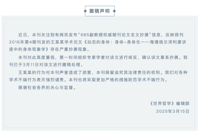 《世界哲学》编辑部3月15日发布撤稿声明:近日,本刊关注到有网民发布“985副教授权威期刊论文全文抄袭”信息,反映我刊2016年第4期刊发的王某某学术论文《动态的身体:身体-身体化——海德格尔泽利康讲座中的身体现象学》存在严重抄袭现象。本刊对此高度重视,第一时间组织专家学者对该文进行核实,确认该文章系抄袭。我刊已于3月11日对该文进行撤稿处理。王某某的行为对本刊声誉造成了损害,本刊保留追究其法律责任的权利。我们对各种学术不端行为表示强烈谴责。本刊也将采取更加严格的措施防范学术不端行为。