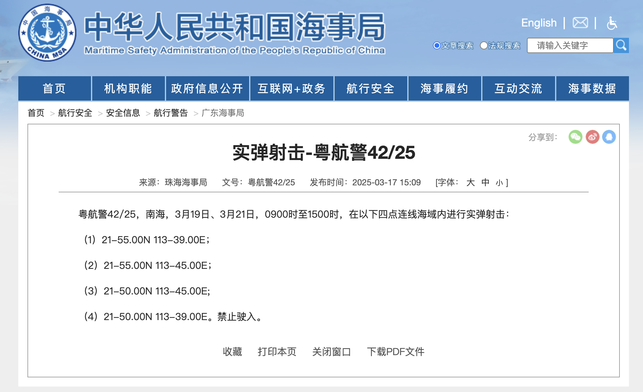 据中国海事局网站消息,珠海海事局发布航行警告,3月19日、3月21日,9时至15时,南海部分海域进行实弹射击,禁止驶入。