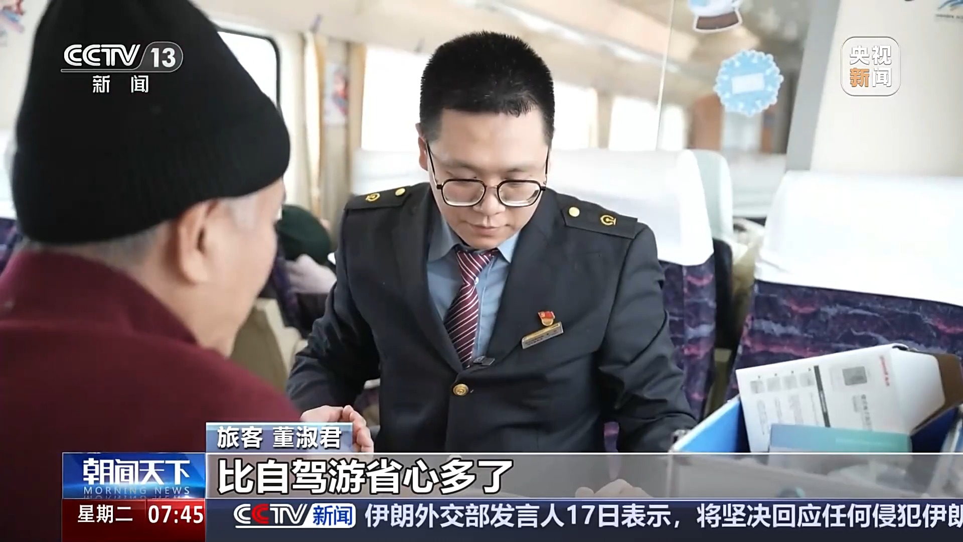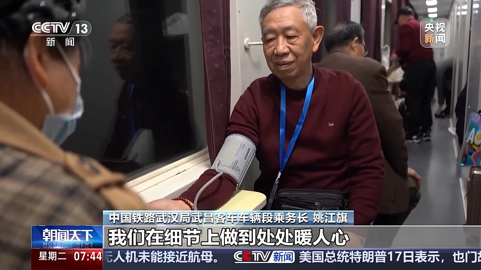 中国铁路武汉局武昌客车车辆段乘务长 姚江旗:针对“银发”游客,我们在细节上做到处处暖人心,厕所内铺设防滑地板布,电茶炉设计防溅洒小托盘,集便器升级为家用坐式马桶,在冲洗按钮处张贴温馨提示语。