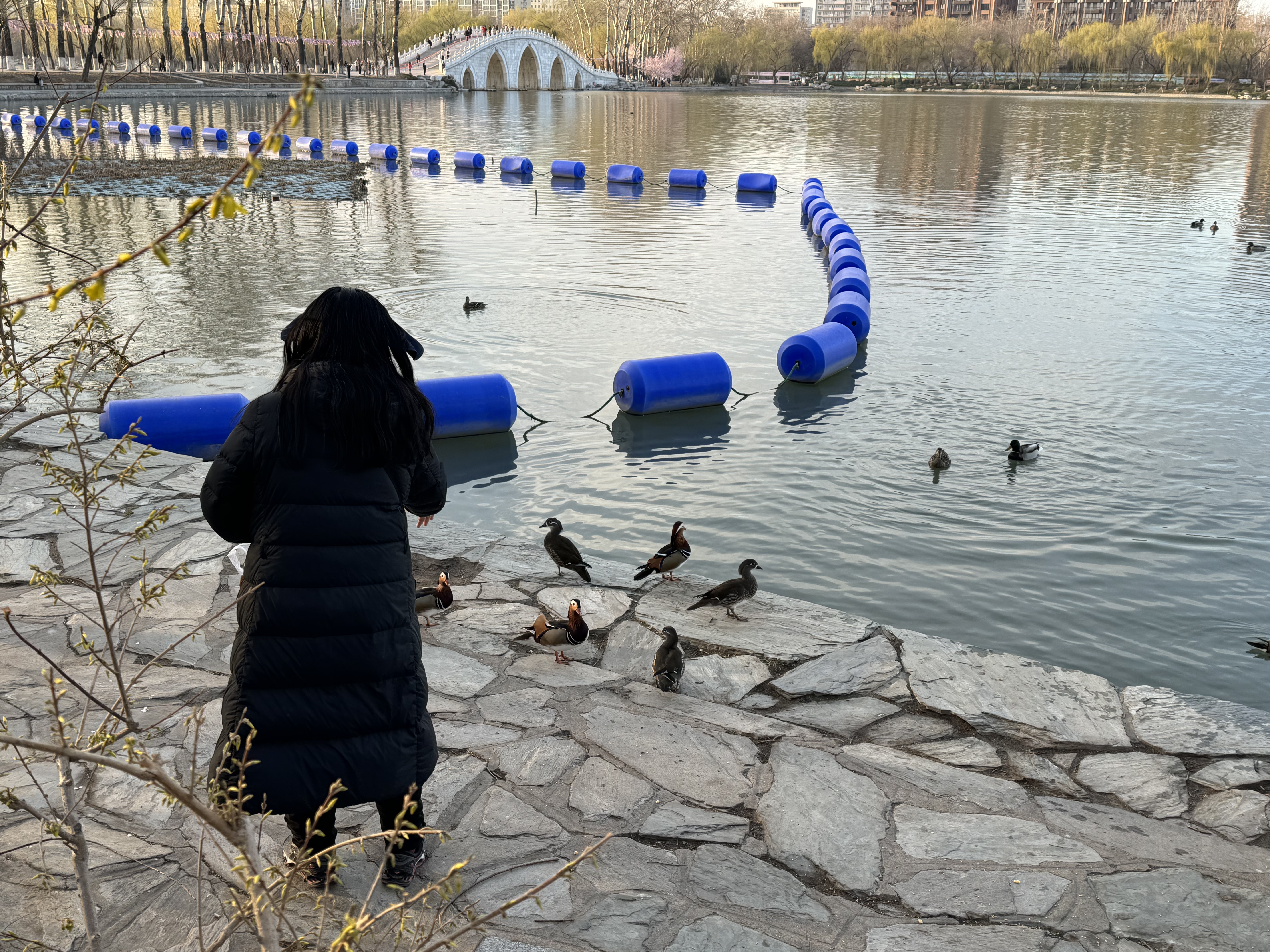 3月18日,玉渊潭公园内游人如织。波光粼粼的湖面上,黑天鹅、绿头鸭、小䴙䴘、鸳鸯到了求偶的时节,在水面上追逐嬉戏,一片热闹的初春景象。在中堤桥南侧,一位女士弯着腰,不时从随身的袋子里掏出一把粮食,撒向湖岸边的石台,金黄色的稻谷和玉米粒撒了满地,许多鸟类被吸引了过来,低头在地上啄食,也引来众多游客围观拍照。