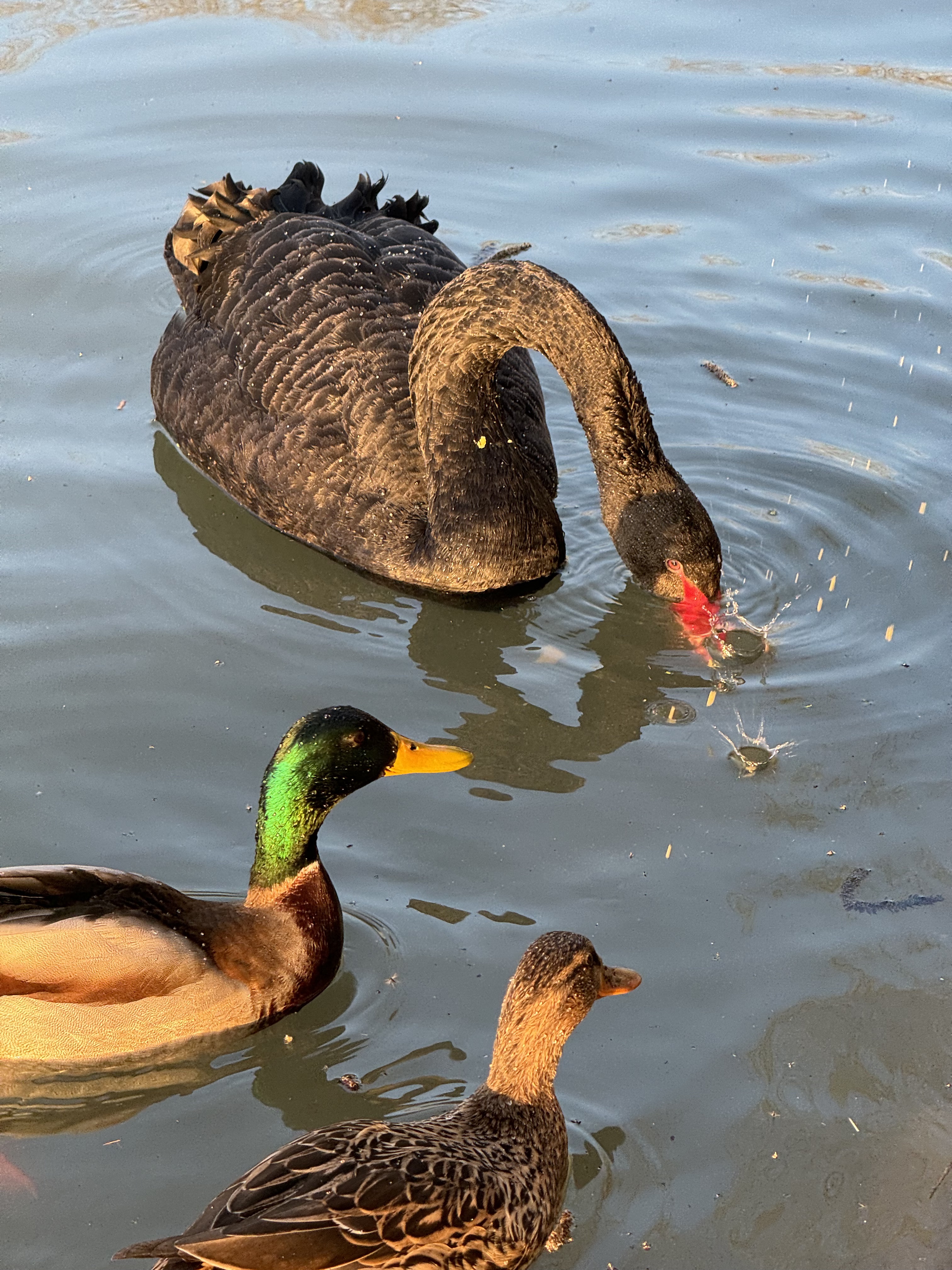 在公园西湖南岸,有游客正在喂黑天鹅。只见岸边观鸟的人群中,一位老人偷偷从自己的背包中掏出了窝头、菜叶子,一块块掰开扔到水中。原本在湖中湿地休息的黑天鹅顿时被吸引过来,凑到岸边进食。只见一片片菜叶子被扔到水里,黑天鹅吃不了的就漂浮在水面上;一块块被掰开的黄色窝头,也令黑天鹅应接不暇,在它低头啄食时,甚至好几次被新扔下来的窝头砸到了头。