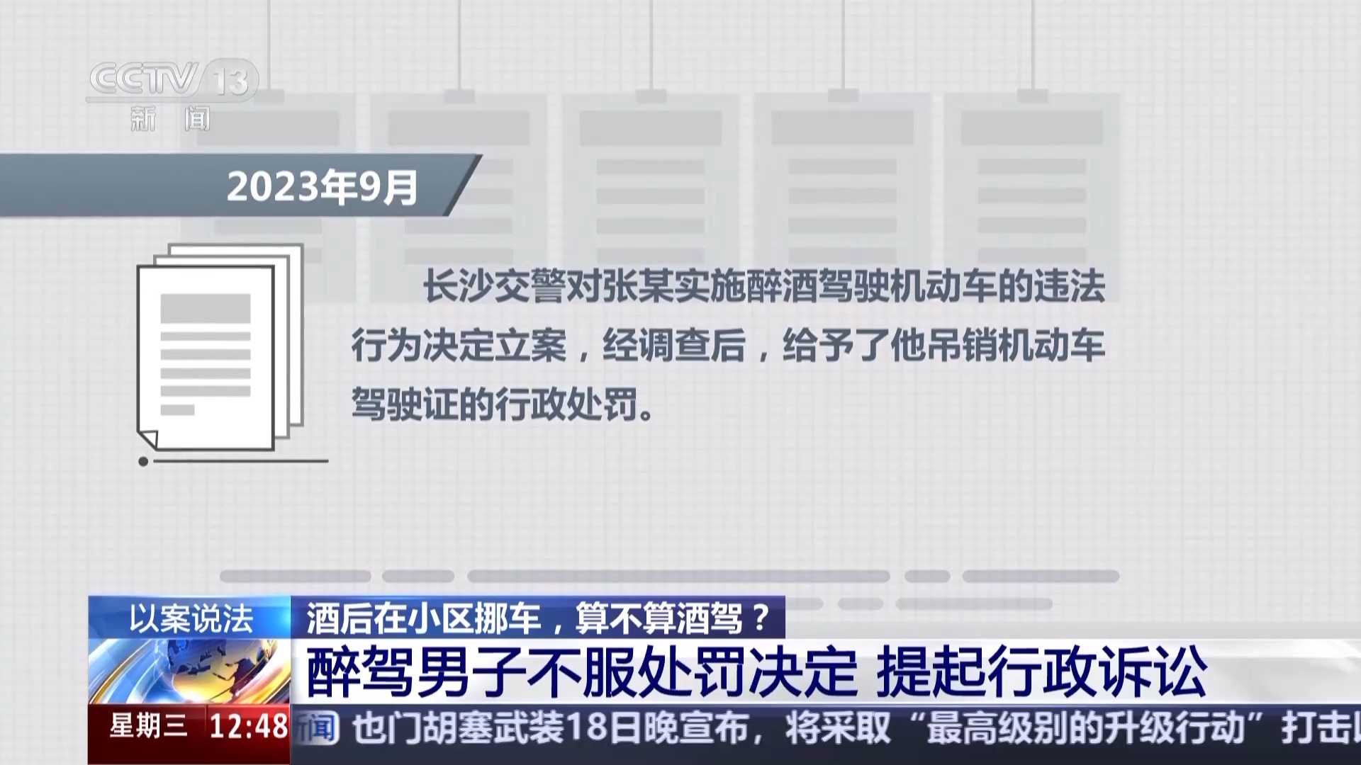 长沙铁路运输法院立案庭庭长 温海敏:张某不服这个处罚决定,他认为当时就是在小区内挪了个车,小区内的道路不属于道路交通安全法规定的道路,不应当对他作出相应的行政处罚。他认为交警部门对于小区内的道路没有行政执法权,所以他向我们法院提起了行政诉讼,请求撤销案涉行政处罚决定。