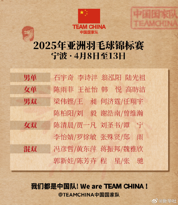 2025年亚洲羽毛球锦标赛将于4月8日-13日在宁波举行。国羽五个单项均满额参赛,一起为他们加油!