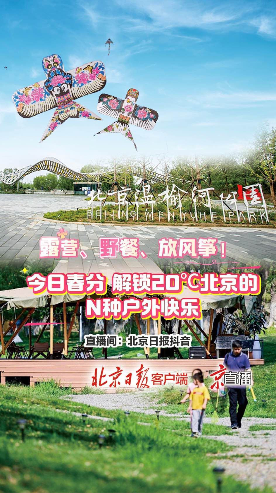 3月20日春分,北京气温飙升到20℃。春日正好,风筝正高!北京日报京直播带您走进朝阳区温榆河公园,开启一场春日限定狂欢!搭帐篷、享冷餐、放风筝、玩趣味游戏,感受春分传统习俗的魅力。春日的温榆河公园绿意盎然,花香四溢,正是踏青放松的好去处。无论你是风筝爱好者,还是春日野餐达人,这里都有属于你的快乐!锁定北京日报抖音直播间,和我们一起拥抱春天,放飞心情,共度美好时光!不见不散!
