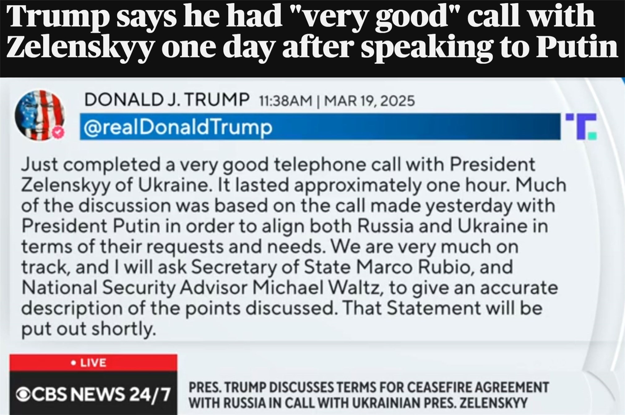 此前一天,特朗普与俄罗斯总统普京进行了通话,双方同意俄乌冲突需要以实现长久和平结束,停止冲突将从能源和基础设施停火开始,同时将就实施黑海海上停火、全面停火和永久和平进行技术谈判。