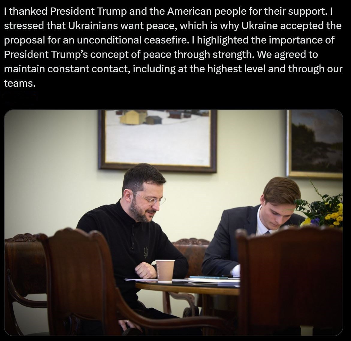 泽连斯基感谢特朗普和美国人民的支持,强调乌克兰人希望和平,这是乌克兰接受无条件停火提议的原因。双方同意保持经常性联系。