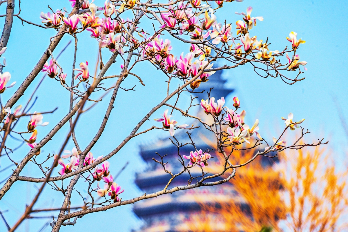 玉兰花开好时节,燃灯塔及周边古建筑群作为绝佳的春日打卡地,人气渐增。虽是工作日,但前来赏花的市民络绎不绝,还有游客特意来拍汉服美图。十余株玉兰树笔直挺拔,屹立在大成门殿西侧,目前大部分已经盛开,东侧的几株玉兰花树含苞待放,整体开放程度六七成,预计本周末将进入盛花期。白里点粉的花朵亭亭玉立,搭配上文庙古建的红墙灰瓦、飞檐斗拱,好似一幅绝美的中国画。