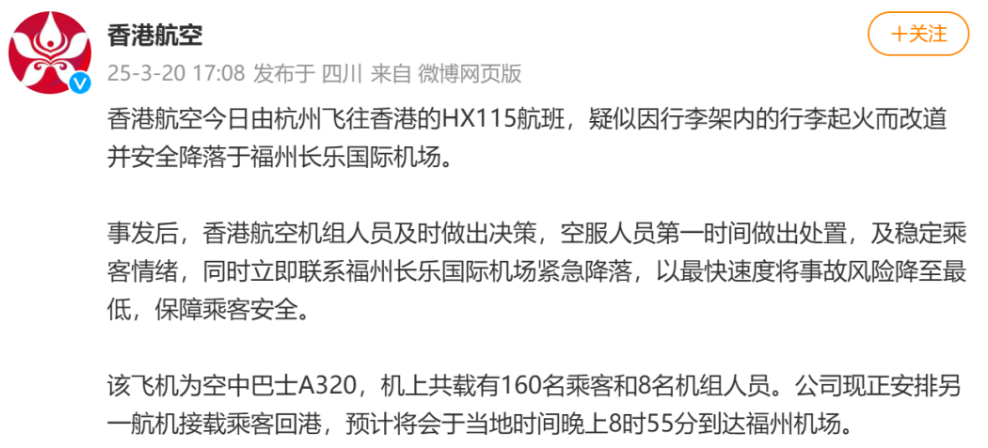 香港航空HX115航班因客舱起火
