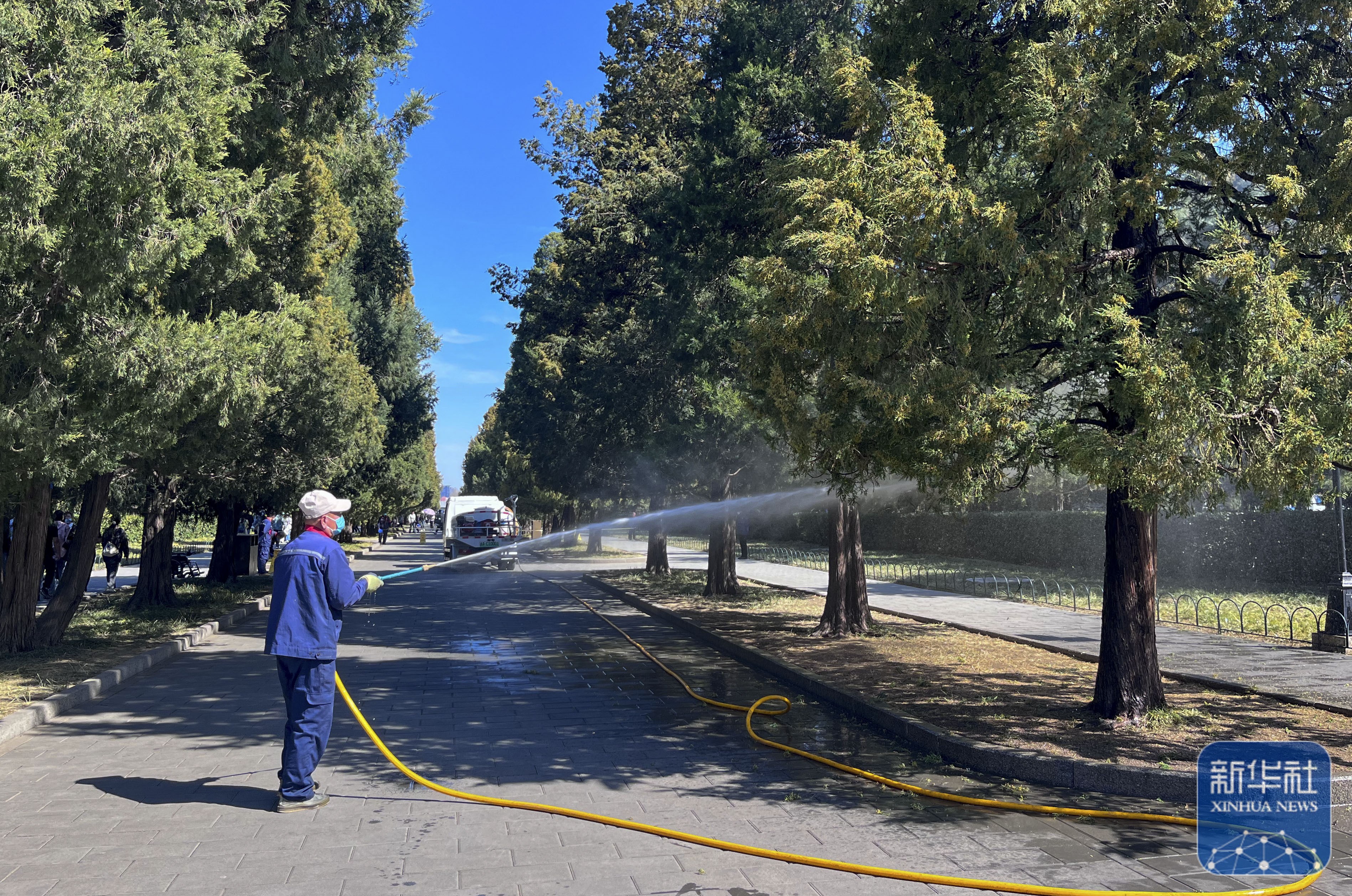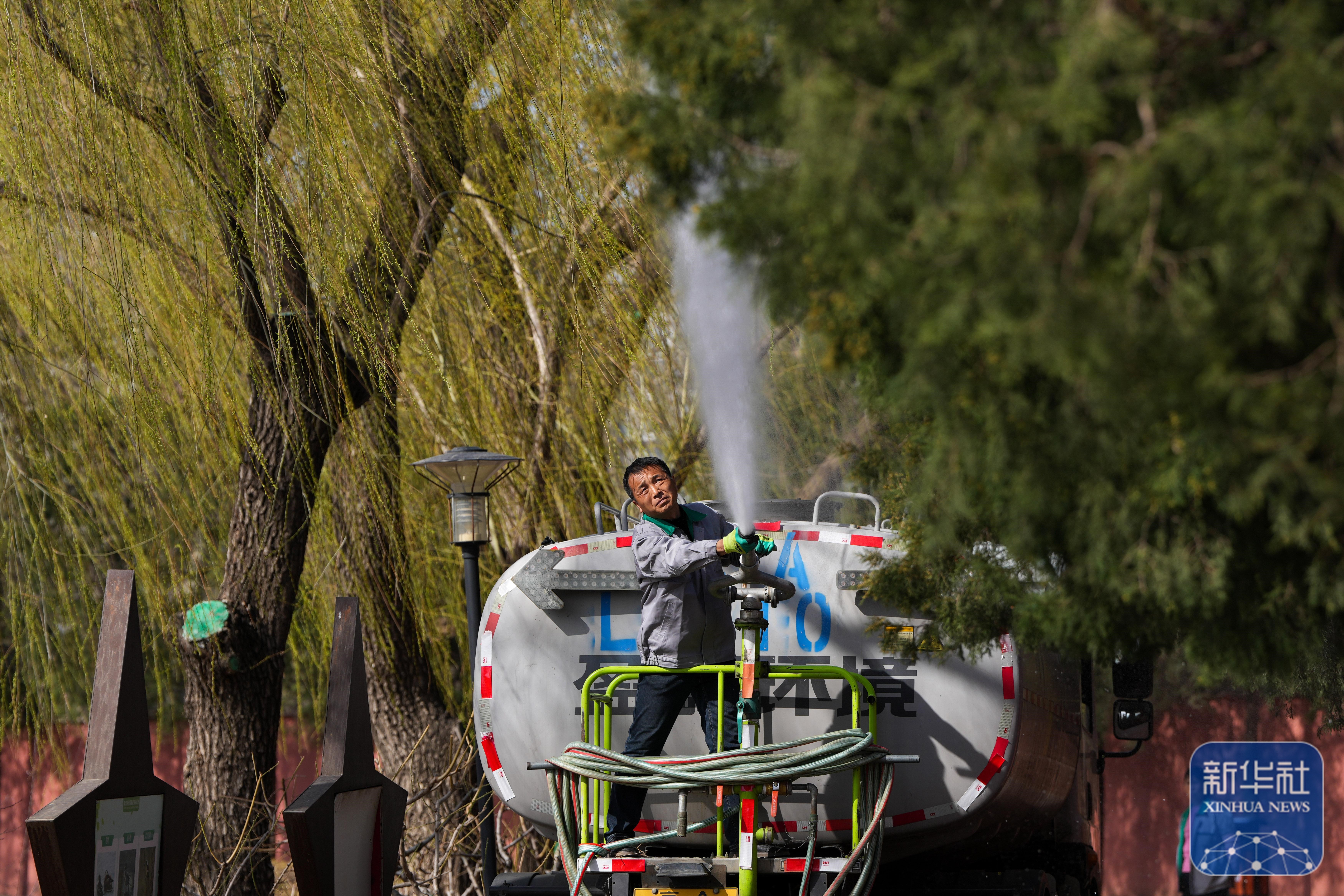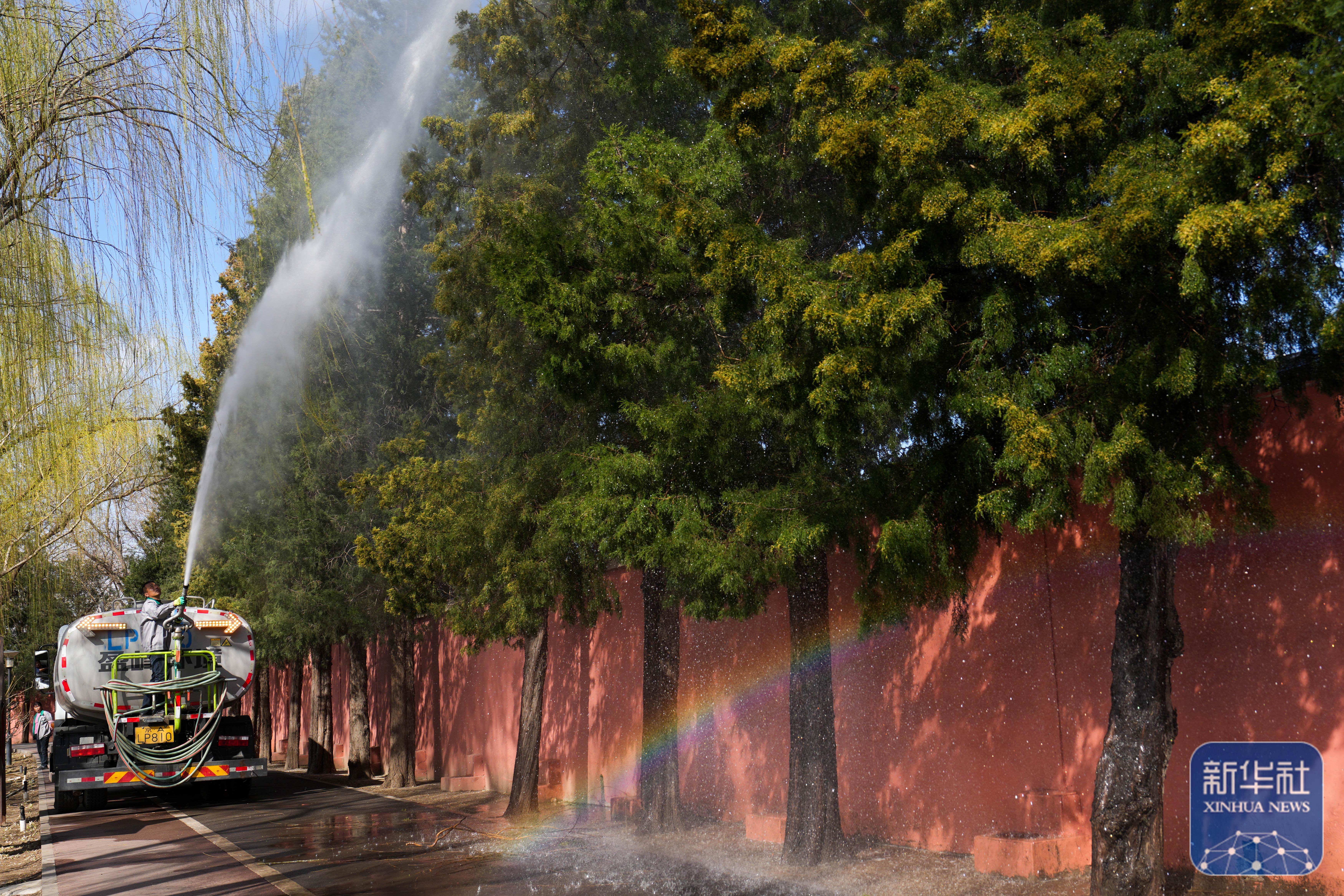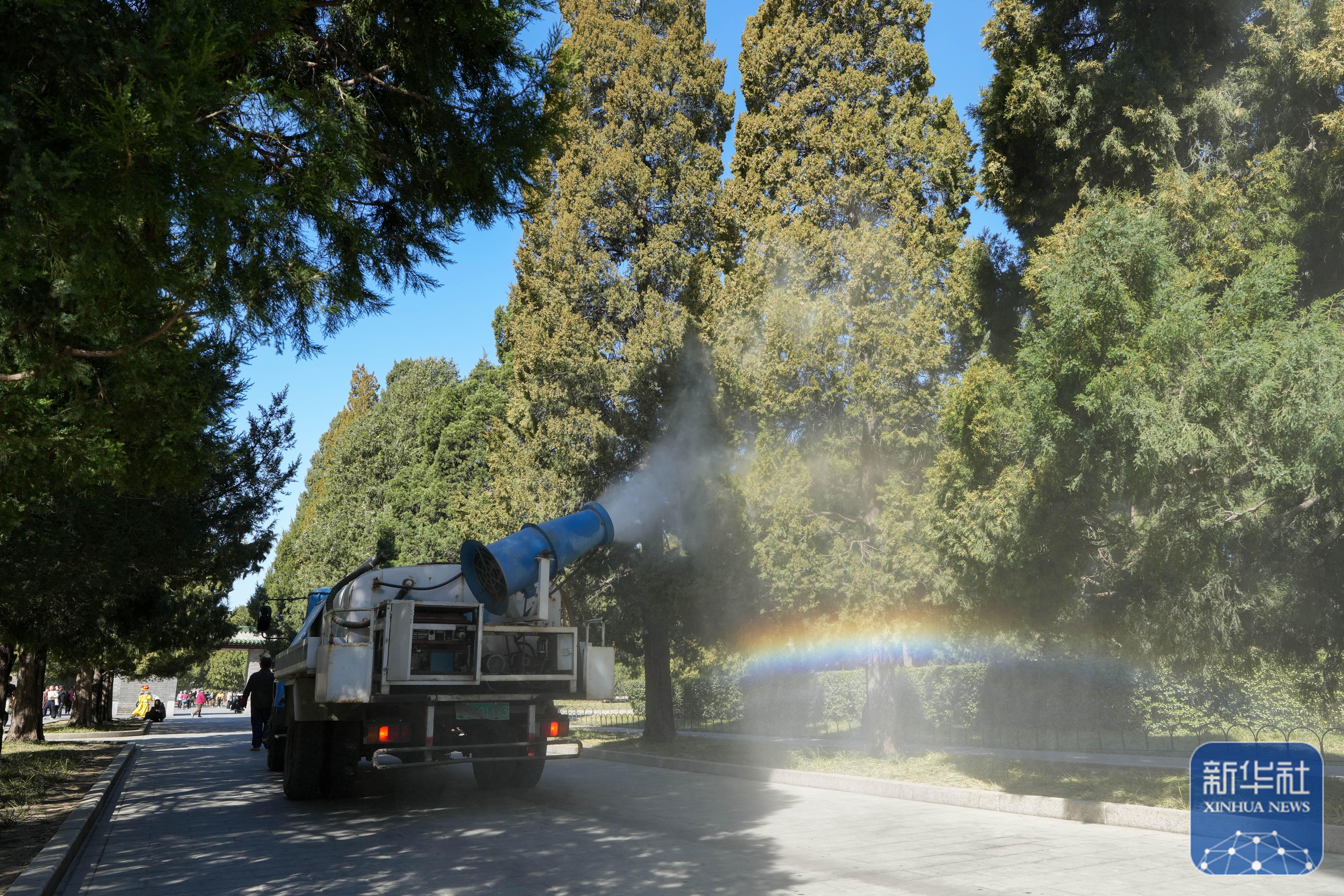 公园工作人员开着雾炮车对着柏树喷淋