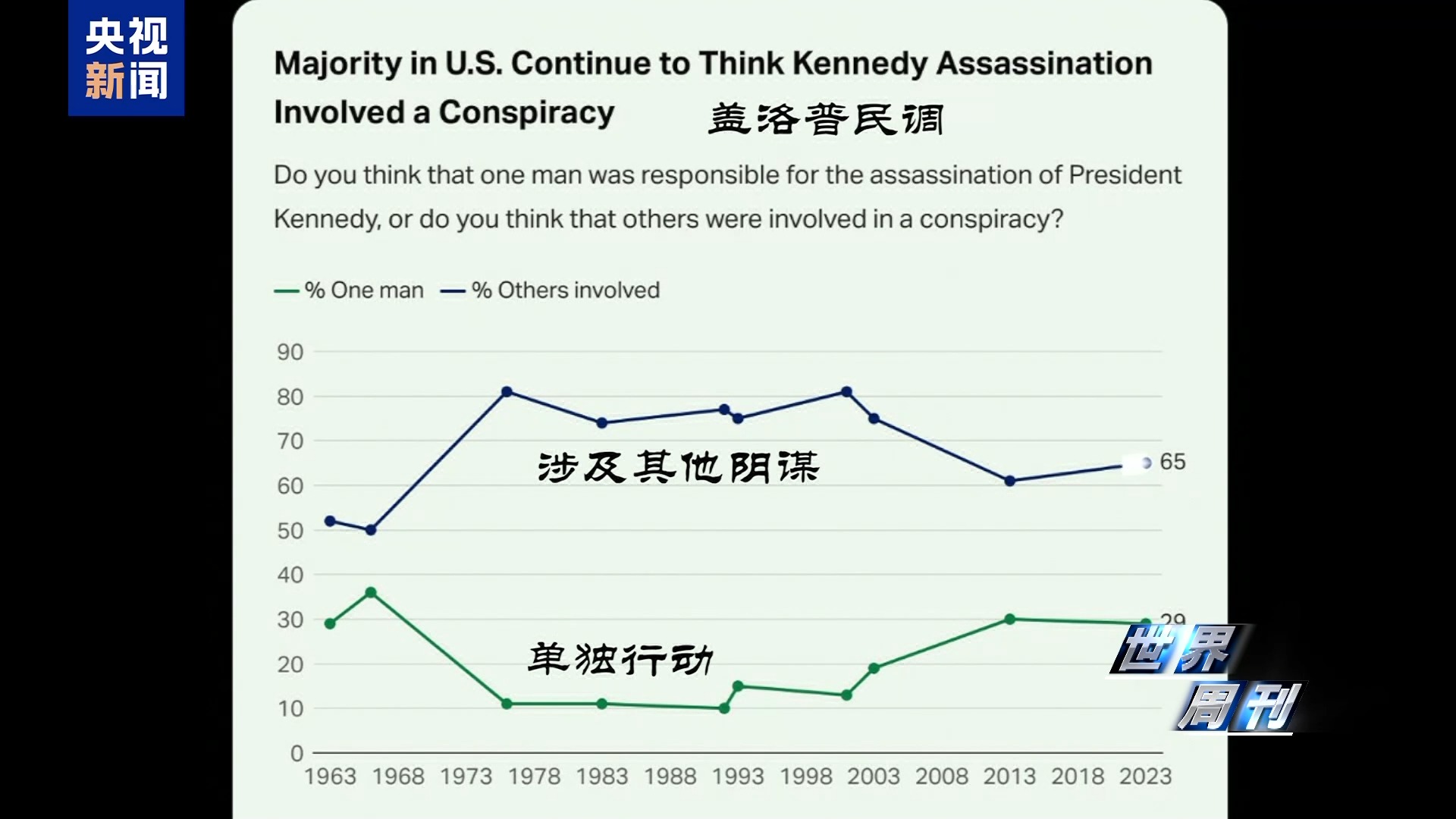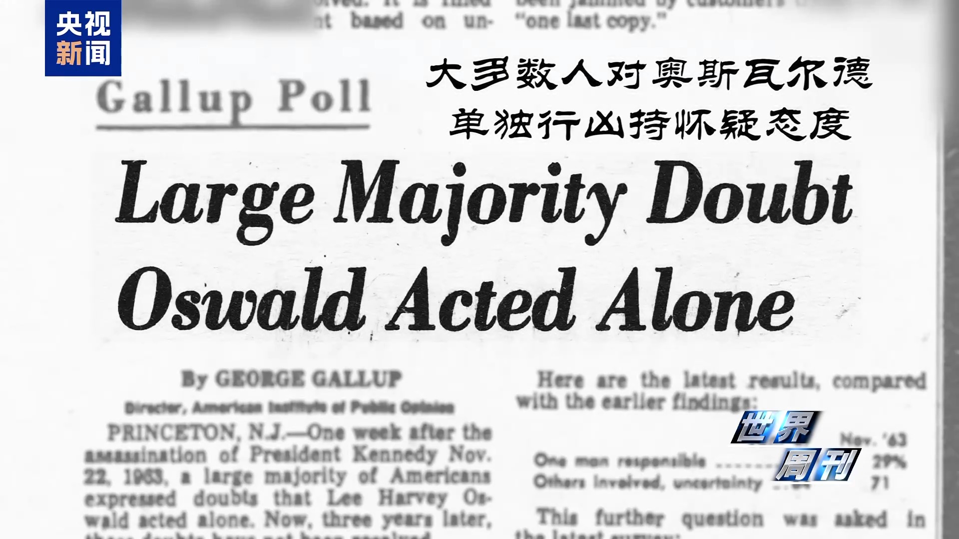 而据盖洛普18日当天公布的民调,时隔近62年,仍有高达65%的美国民众不相信奥斯瓦尔德是单独行动。