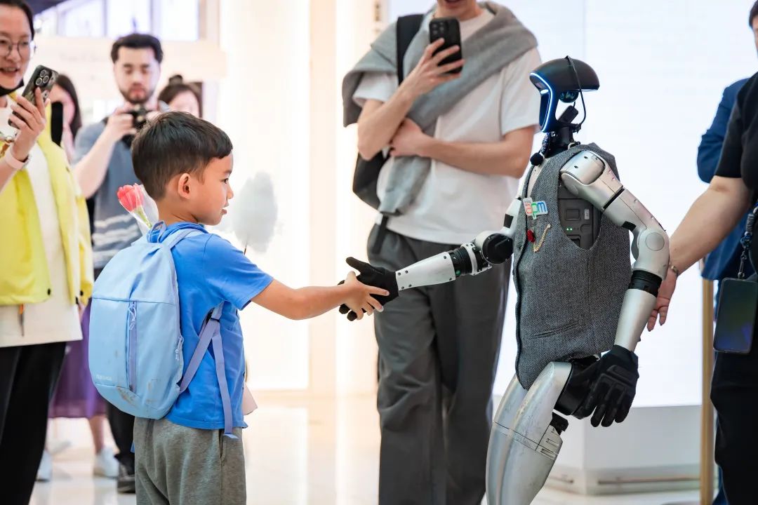 活动特别设置的互动环节,更是将现场气氛推向了高潮。每场次演出结束后,AI人型机器人都会走下舞台,与观众进行互动。小朋友们兴奋地围了上去,眼中满是好奇与期待。8岁的小林激动地说:“机器人好酷呀,它还会跟我握手!”还有不少小朋友追着机器人在商场里巡游,一场沉浸式科技场景被融入商业及社区生活。