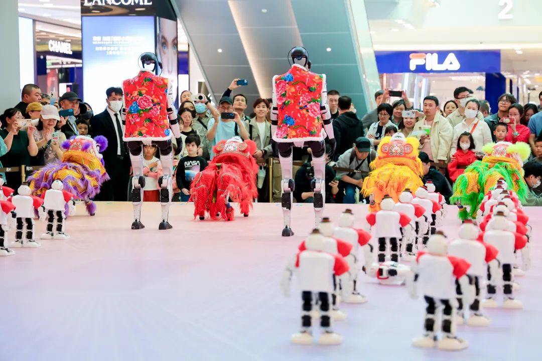 走进北京apm首层中庭,2个AI人型机器人、50个迷你机械人及4只机械狗整齐排列。随着音乐节奏响起,表演正式开始。“春晚同款”AI人型机器人穿上标志性的大花马甲,率先舞动机械臂,精准的律动和流畅的动作让现场观众连连称叹。50个迷你机械人整齐划一的舞蹈动作让人目不暇接,4只机械狗更是造型炫酷,身披舞狮造型的外衣,摇头摆尾,随着音乐节奏欢快热舞,那模样憨态可掬又充满科技感。