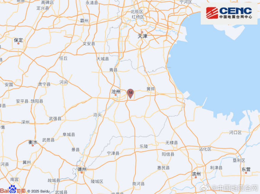 河北沧州市沧县发生2.8级地震,震源深度10千米
