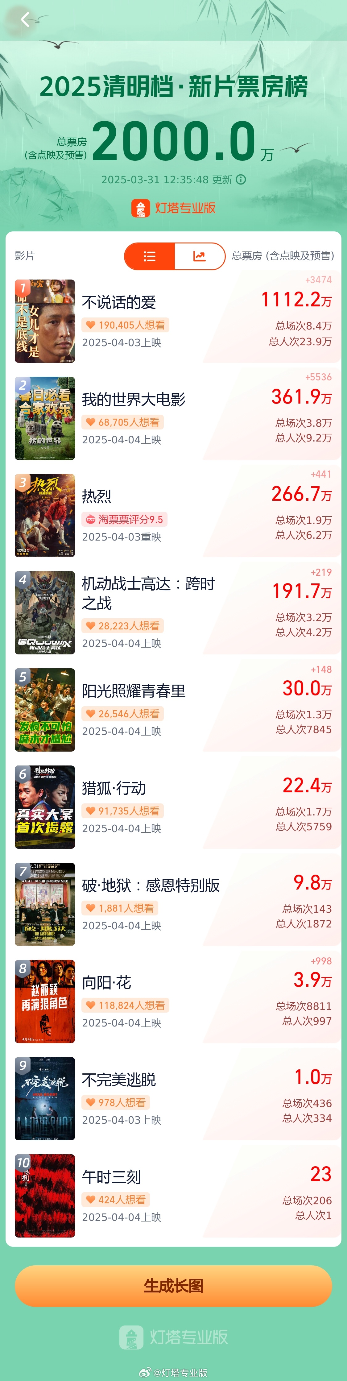 据灯塔专业版,截至3月31日12时35分,2025年清明档10部新片(含重映)预售总票房(含点映)突破2000万。