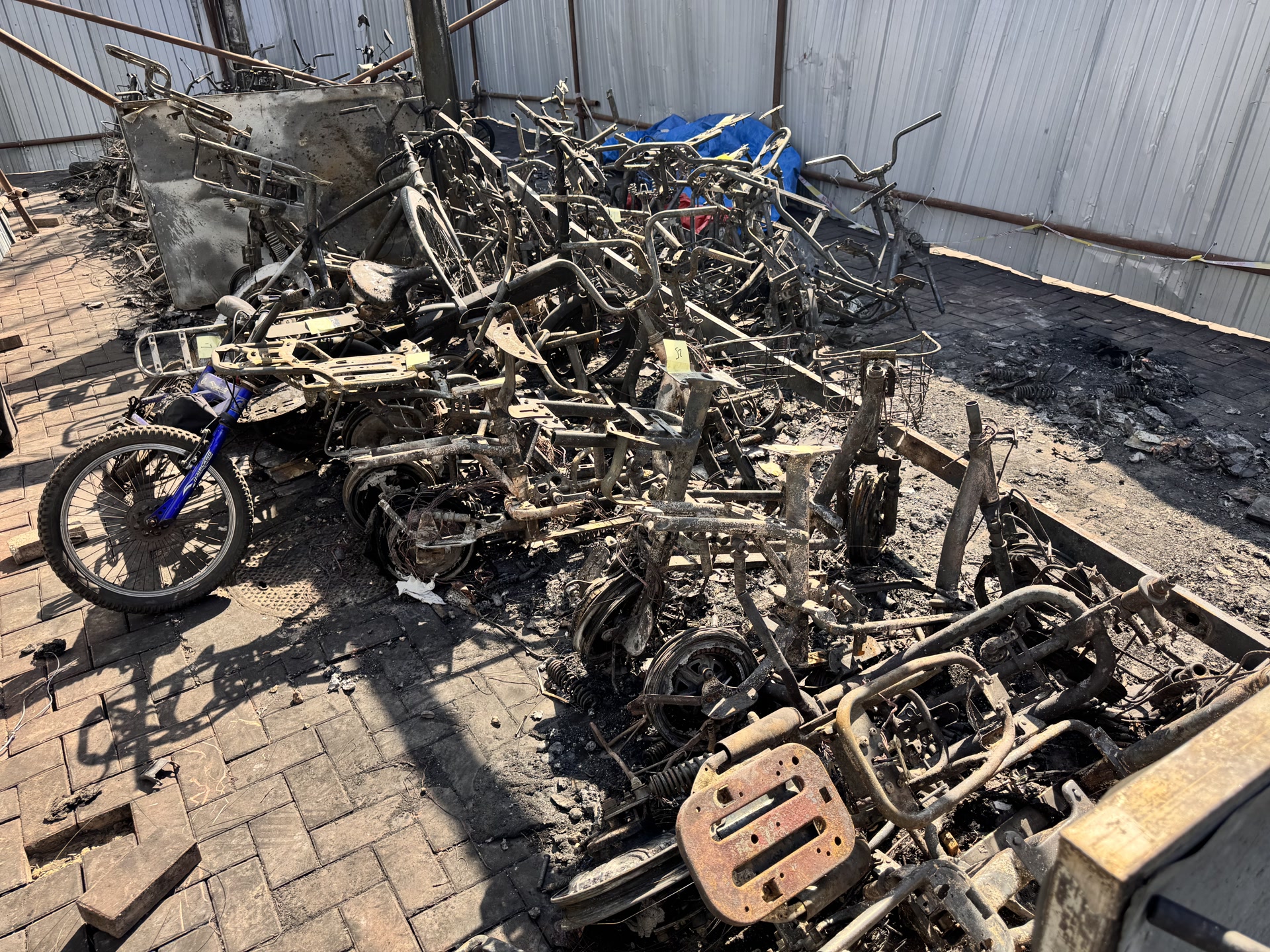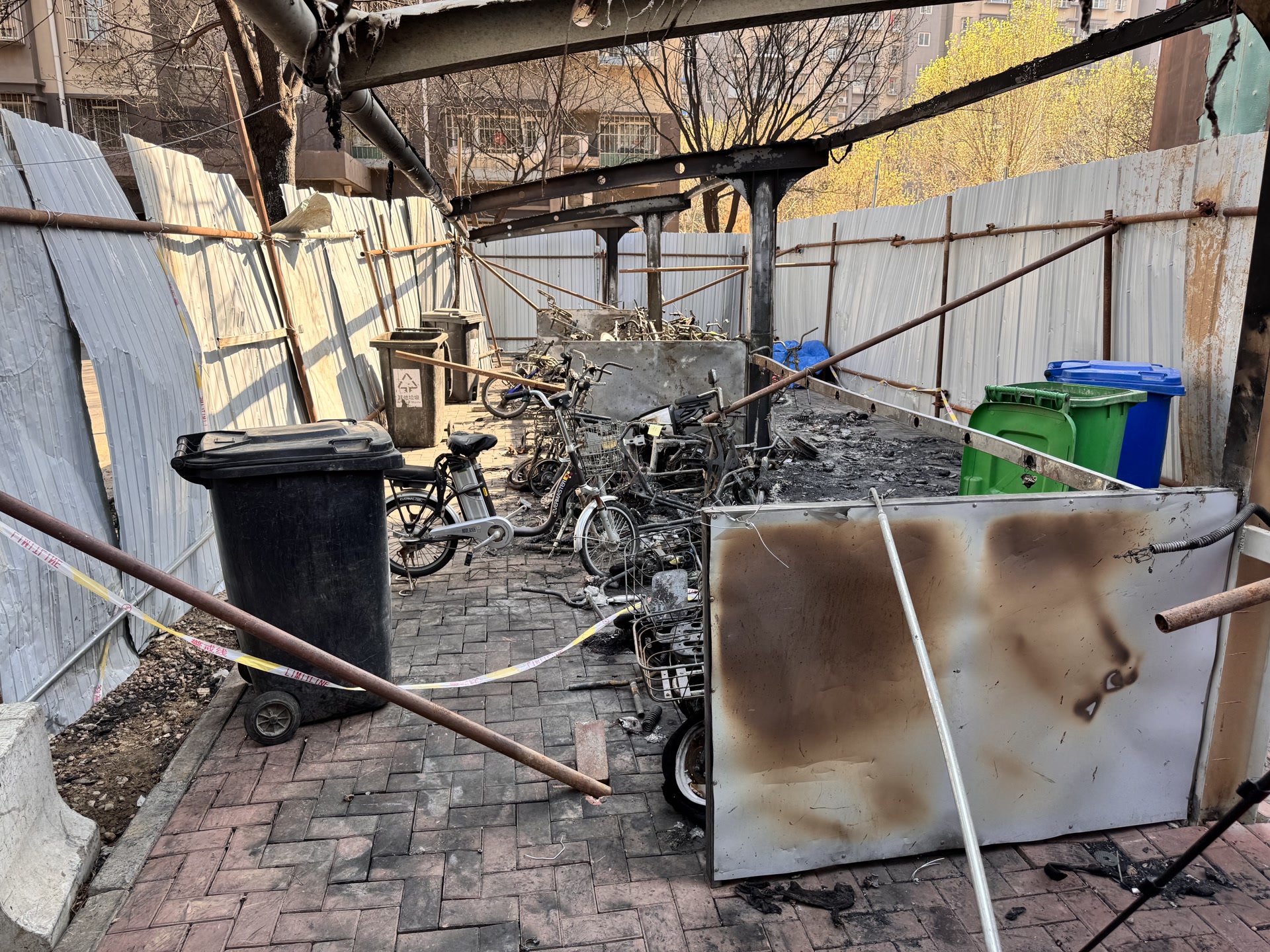 在丰台区南庭新苑南区15号楼东侧,记者看到了过火后的充电车棚:顶棚已被烧穿,电动自行车只剩车架残骸,5个盛满水的大垃圾桶摆放在一旁,里面浸泡着车辆电池。