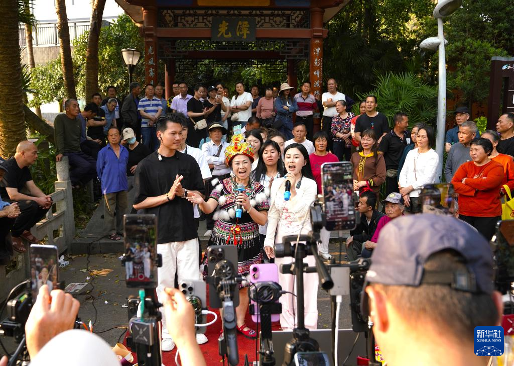 在广西柳州市的鱼峰歌圩,山歌爱好者们在进行“村歌”直播表演。新华社记者 杨驰 摄