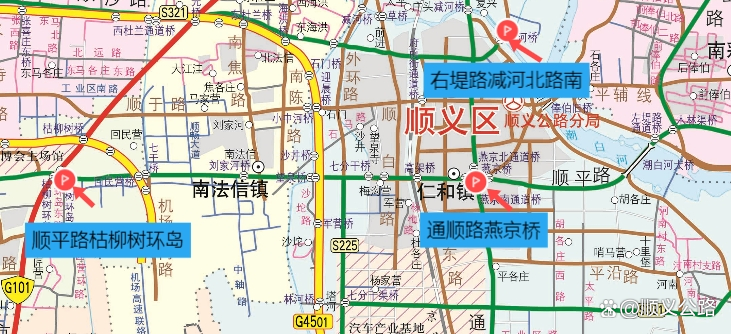 假期内,进出顺义城区日均交通量较大点位分别为顺平路枯柳树环岛、右堤路减河桥路口、通顺路燕京桥。