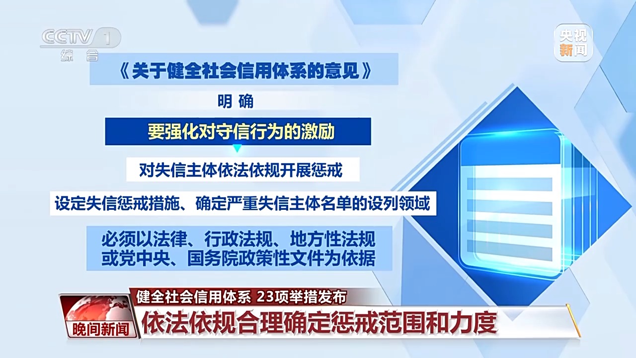 《意见》明确,要强化对守信行为的激励,对失信主体依法依规开展惩戒,设定失信惩戒措施、确定严重失信主体名单的设列领域,必须以法律、行政法规、地方性法规或党中央、国务院政策性文件为依据,其中涉及设定对信用主体减损权利或增加义务的措施,必须以法律、行政法规、地方性法规为依据。