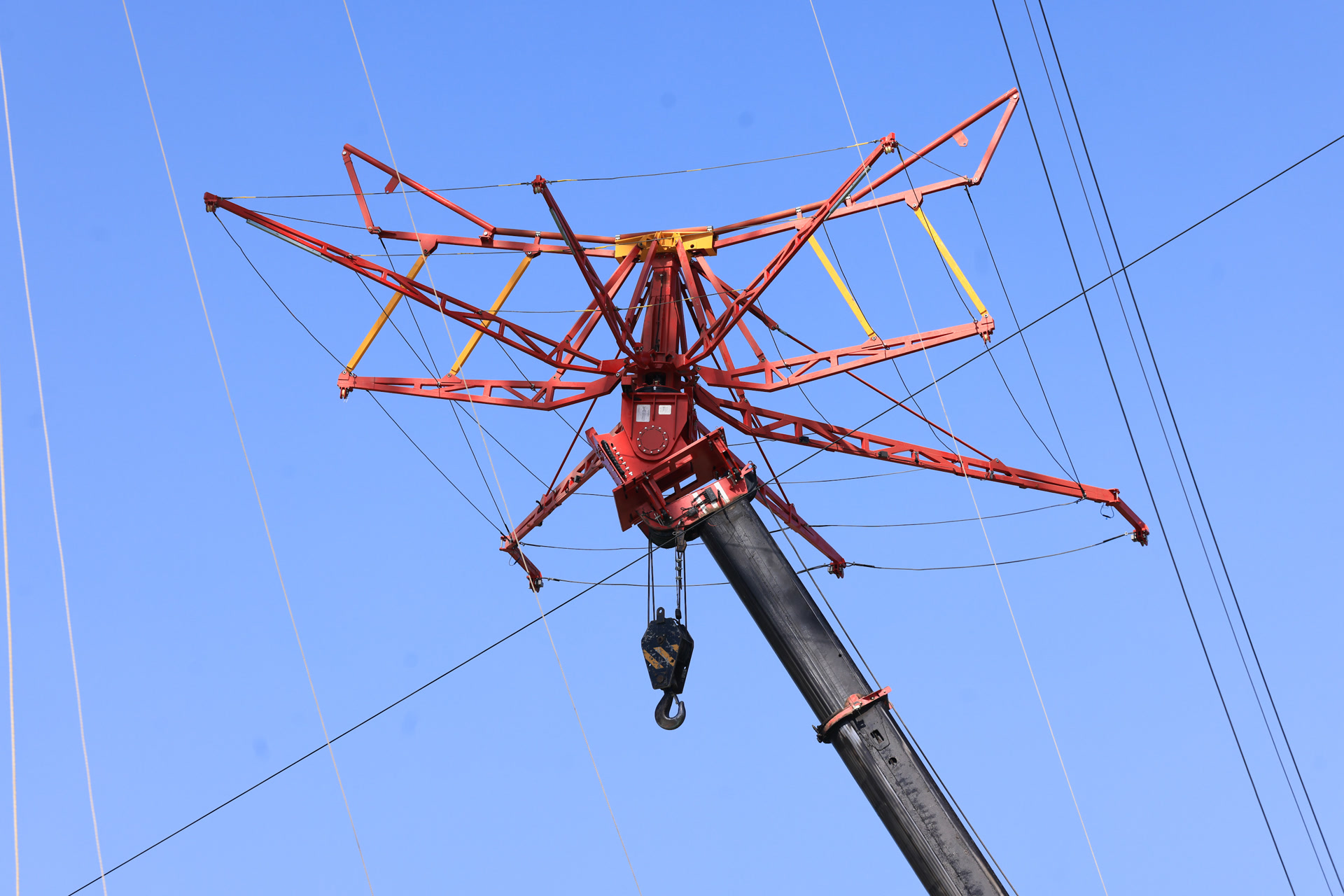 据了解,移动式伞形跨越架是基于雨伞原理,利用汽车式起重机和跨越架结构中的电动回转支撑,将组件展开成一个坚固的骨架系统,精确遮盖保护被跨越目标物。该设备可实现远程操控、无人员高空和近电作业,适用于跨越220千伏及以下输电线路、高速公路、城市主干道和普通铁路等。此次工程应用的移动式伞形跨越架撑开高度达24米,全部展开后长12米、宽8米,精准覆盖在高度约20米的光缆线路上方。
