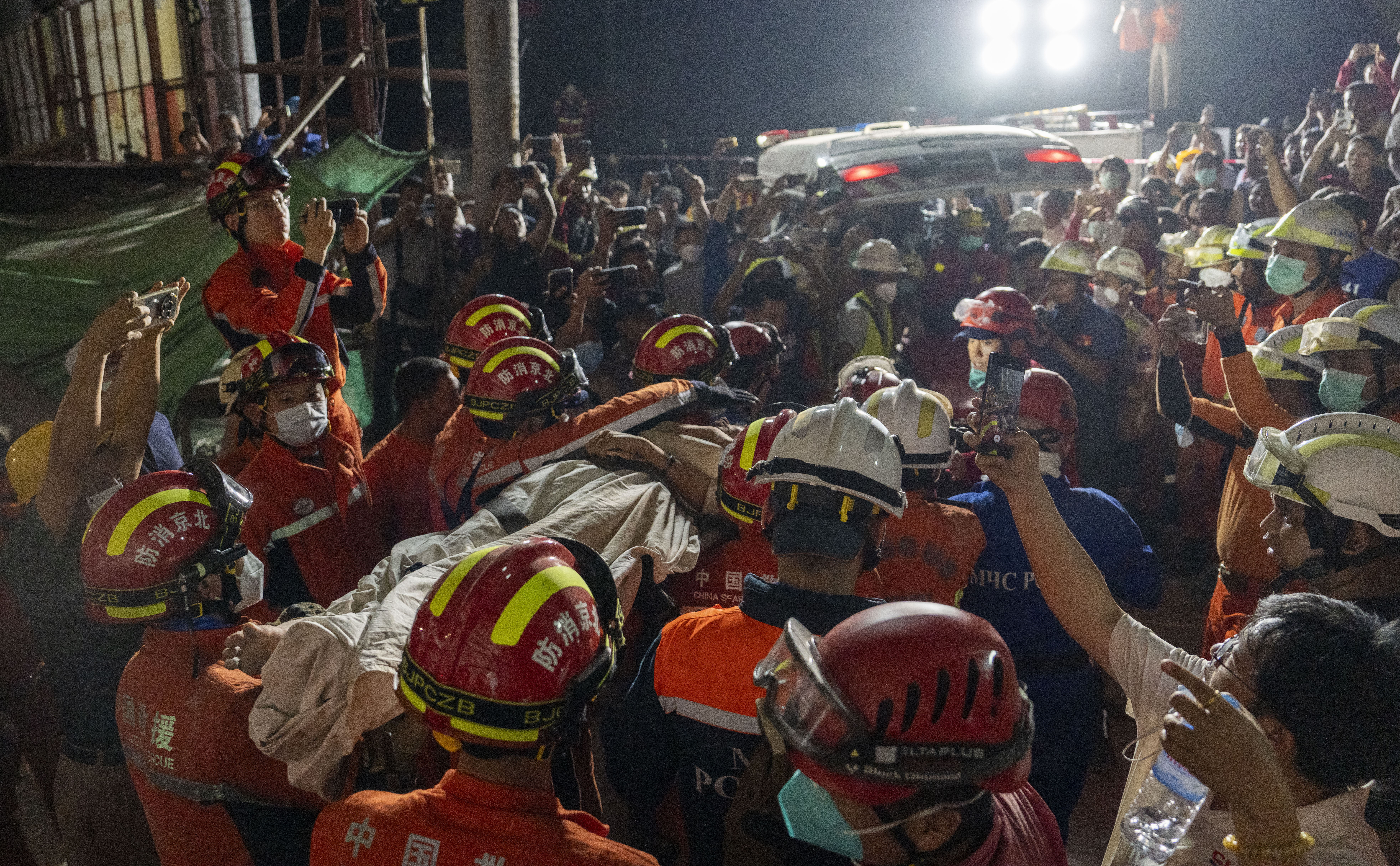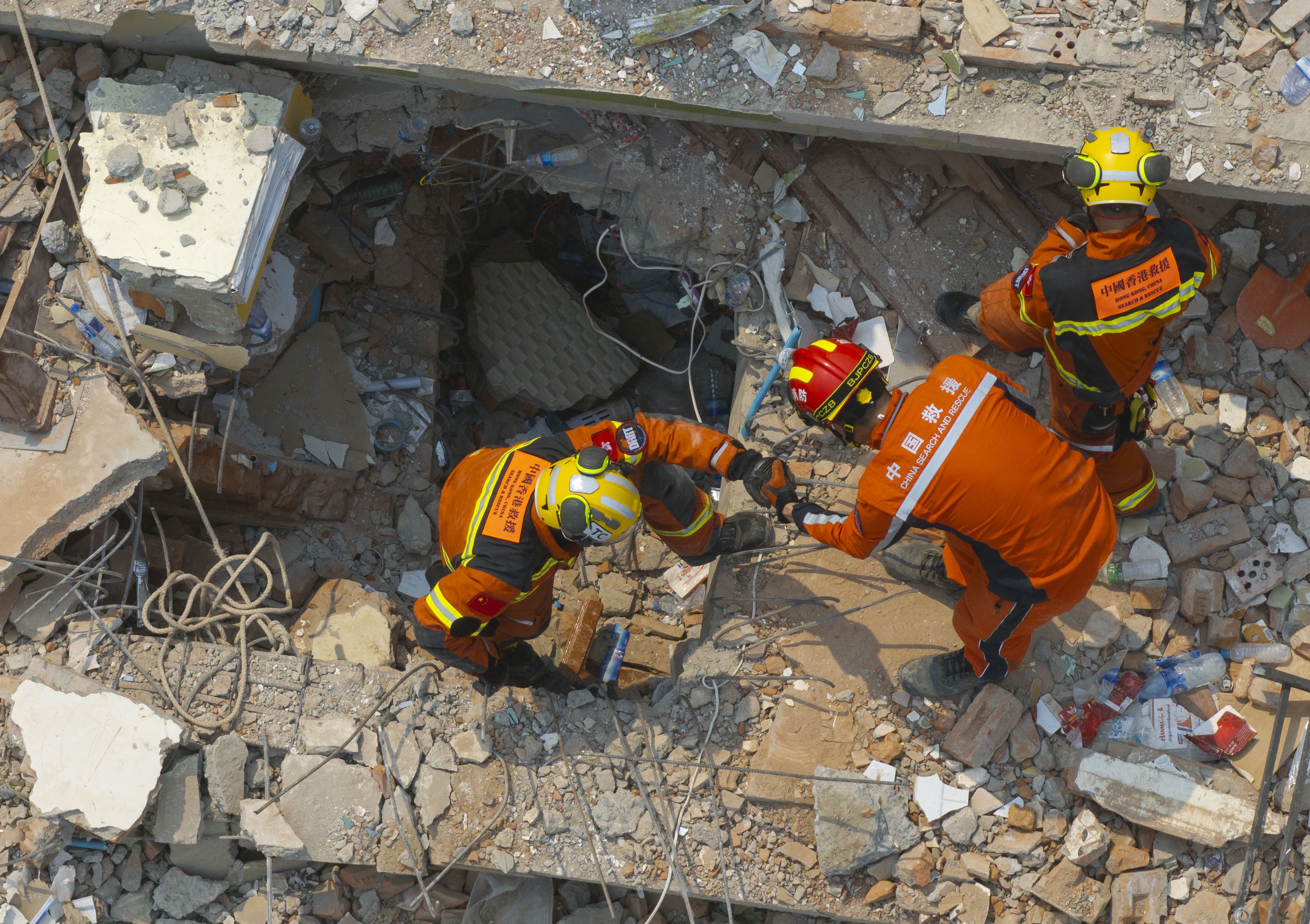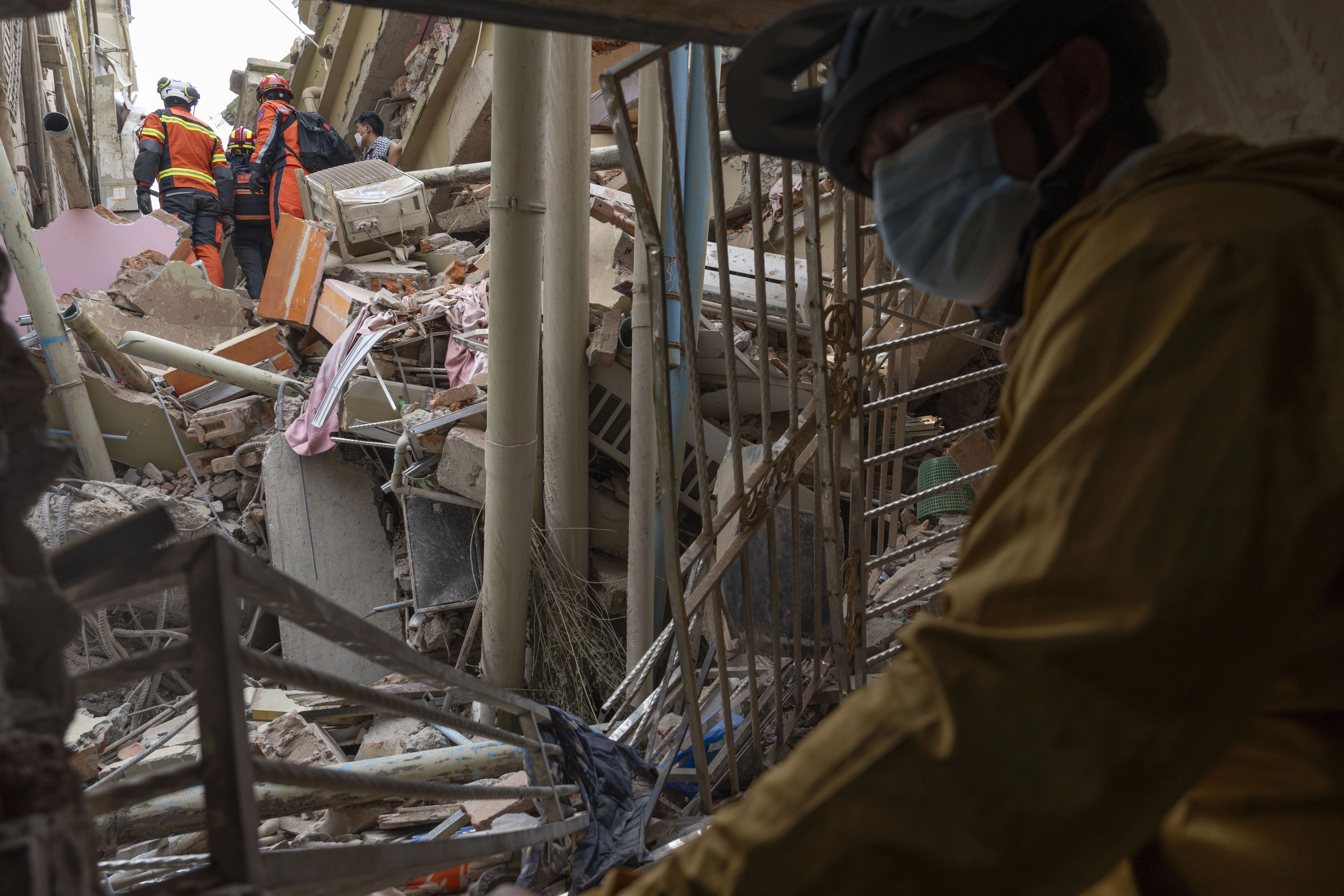 位于曼德勒市区的天空公寓是三栋11层的公寓楼群,其中两座完全坍塌,另一座楼体5层以下发生坐沉垮塌。3月30日上午,当地救援人员在废墟上探测到还有幸存者。中方救援队随即加入,与缅方一道开展工作,分批次进入废墟试图营救幸存者,展开了多轮搜救。