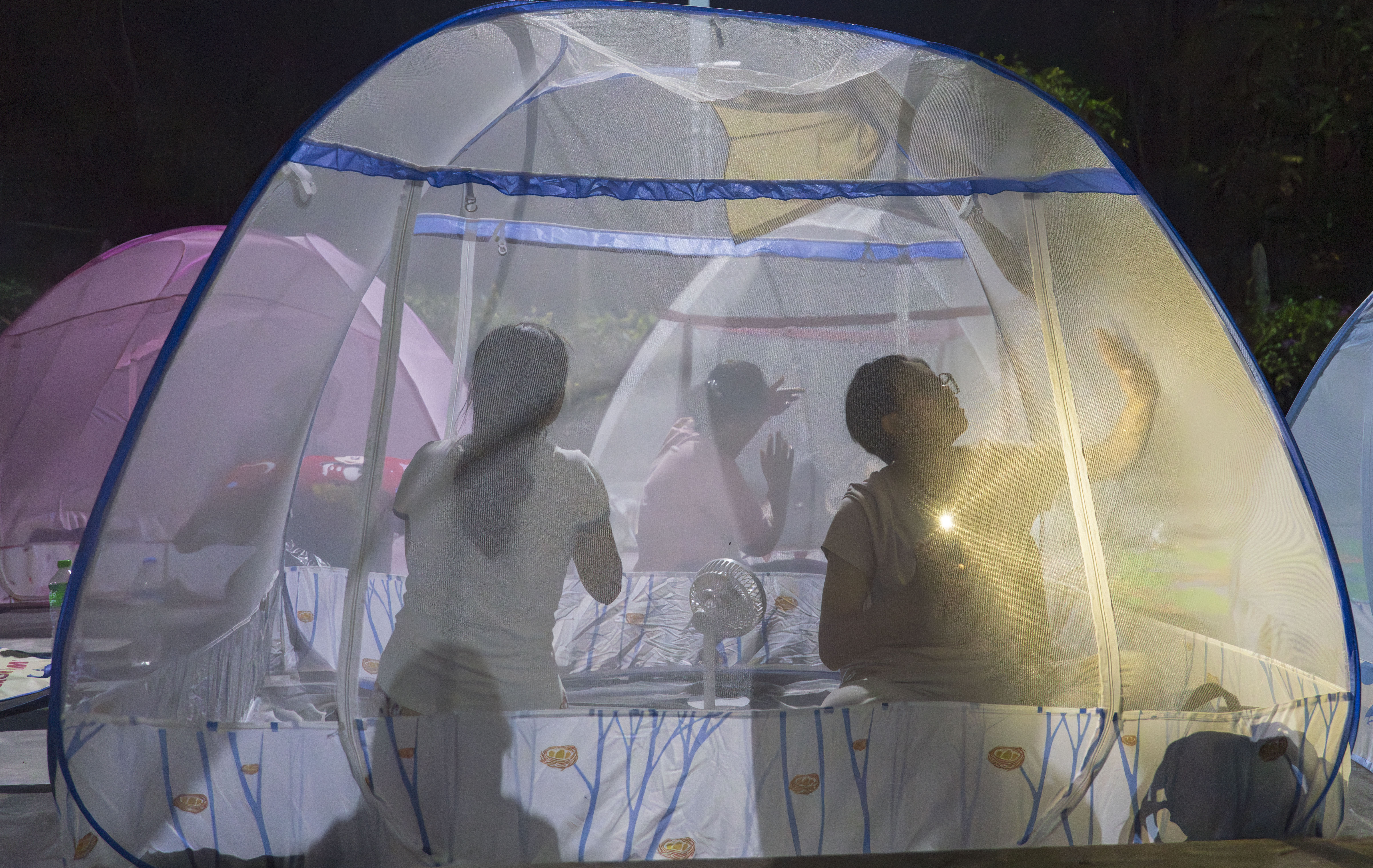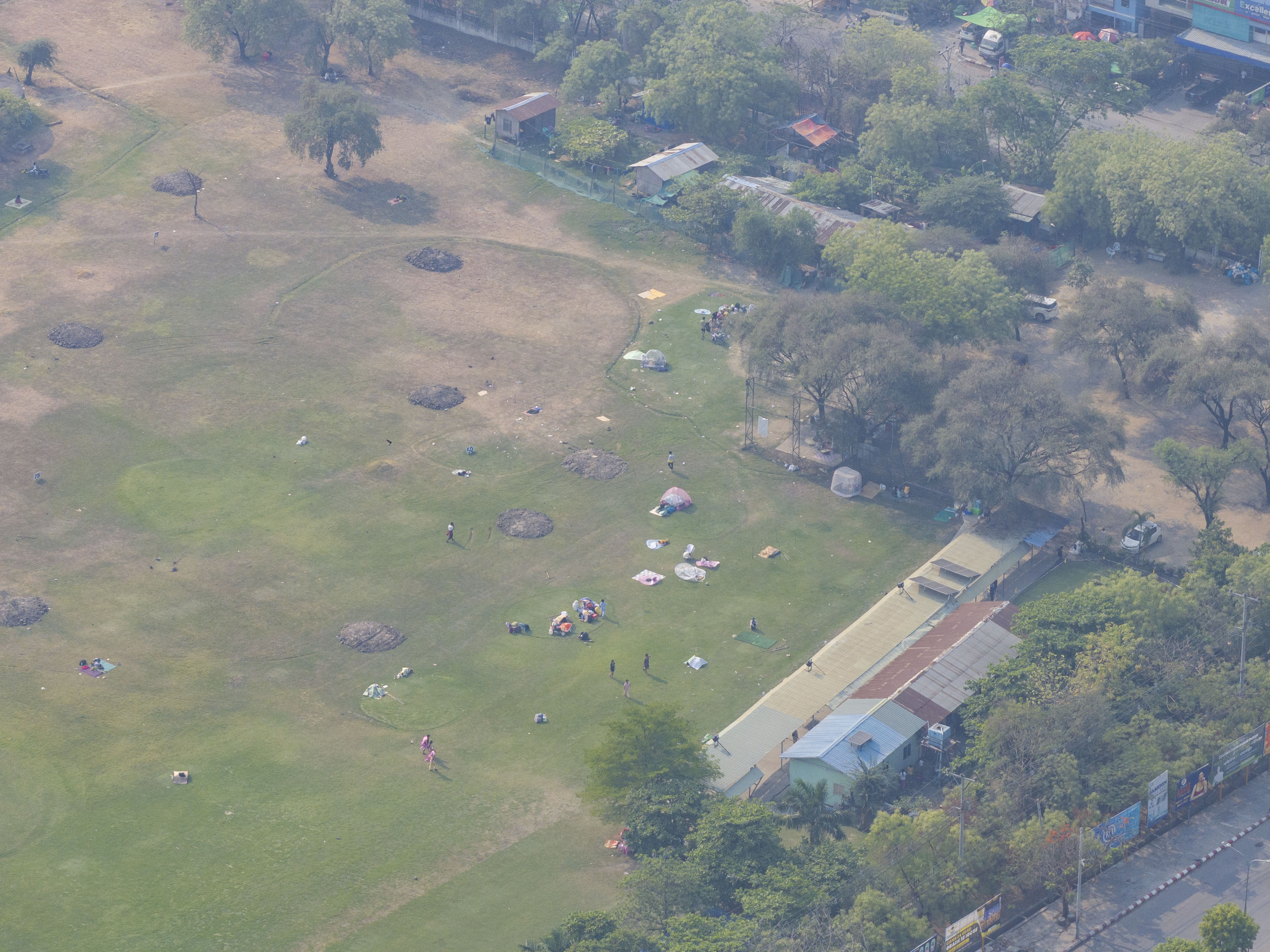 3月底4月初的曼德勒,白天气温接近40摄氏度,高温高湿的环境使得蚊虫肆虐。夜幕降临后,在街头避难的人们或是搭起蚊帐,或是就地铺上凉席而坐。人们围坐一圈,吃着面包,就着瓶装水,脸上满是疲惫,却也露出一丝安宁。