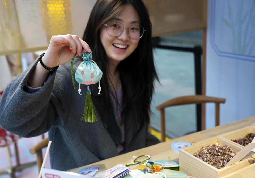 2025年3月20日,游客在上海豫园商城的国潮市集上体验手作香囊。新华社记者 刘颖 摄