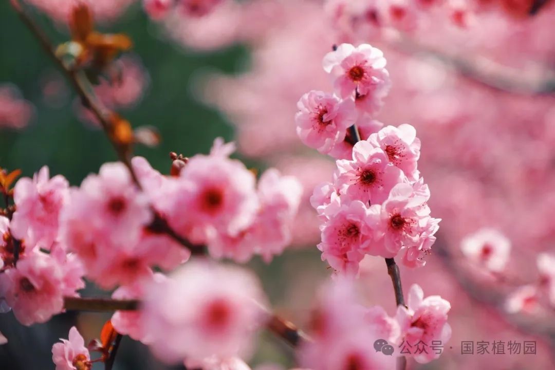 此时数百株的‘美人’梅像是成为了梅园的主人,肆意盛开着,层层叠叠的花瓣氤氲成粉色的云霞,将满园的春色渲染得更加浪漫。